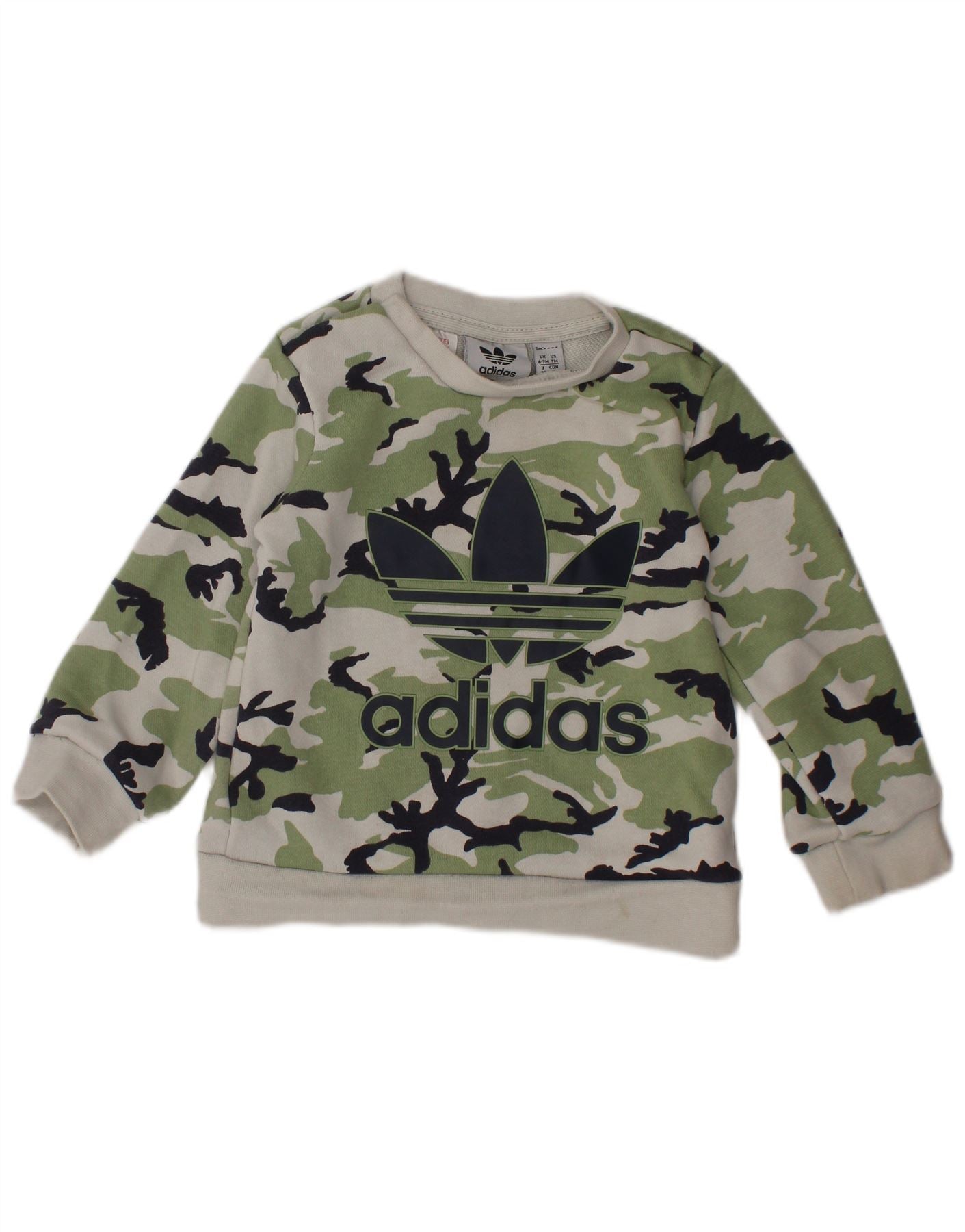 - AI Description: This Adidas baby boys sweatshirt jumper is crafted from soft 100 percent cotton knit fabric. It features a vibrant multicoloured camouflage pattern. The round neck and long sleeves offer comfortable coverage. Cuffed details ensure a snug fit. A prominent logo accent adds signature branding. This regular fit pullover design provides comfort and stretch for active wear.