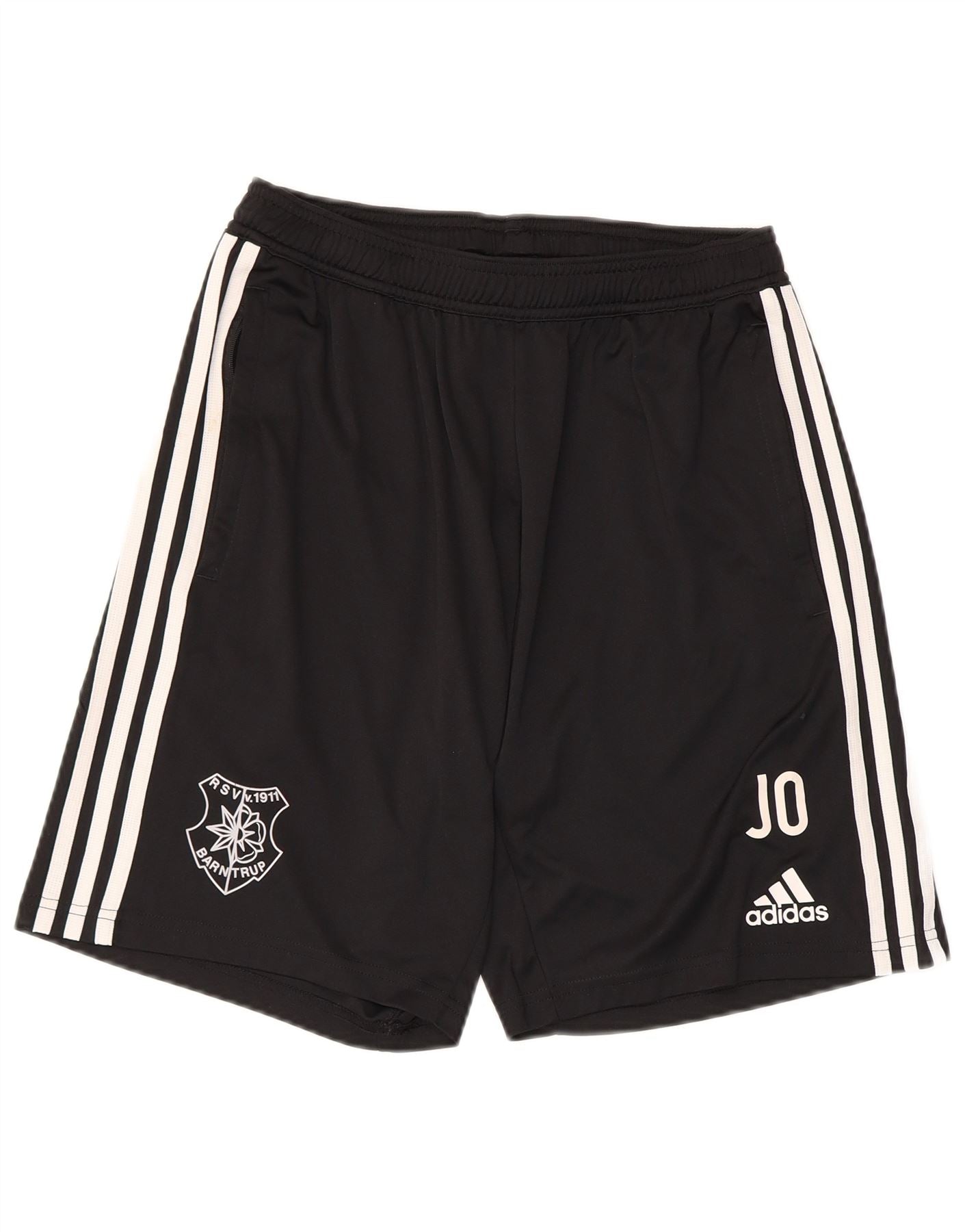 - Descrizione dell'IA: Questi pantaloncini da calcio da uomo Adidas sono realizzati in leggero jersey di poliestere nero, con tecnologia AEROREADY. Hanno una vita elasticizzata per una vestibilità sicura e regolare. Sono incluse pratiche tasche. Il design presenta i classici dettagli a tre strisce bianche lungo i lati. Sono presenti il logo Adidas e le iniziali JO, insieme allo stemma della squadra RSV Barntrup. Questi pantaloncini sportivi sono ideali per le prestazioni sportive.