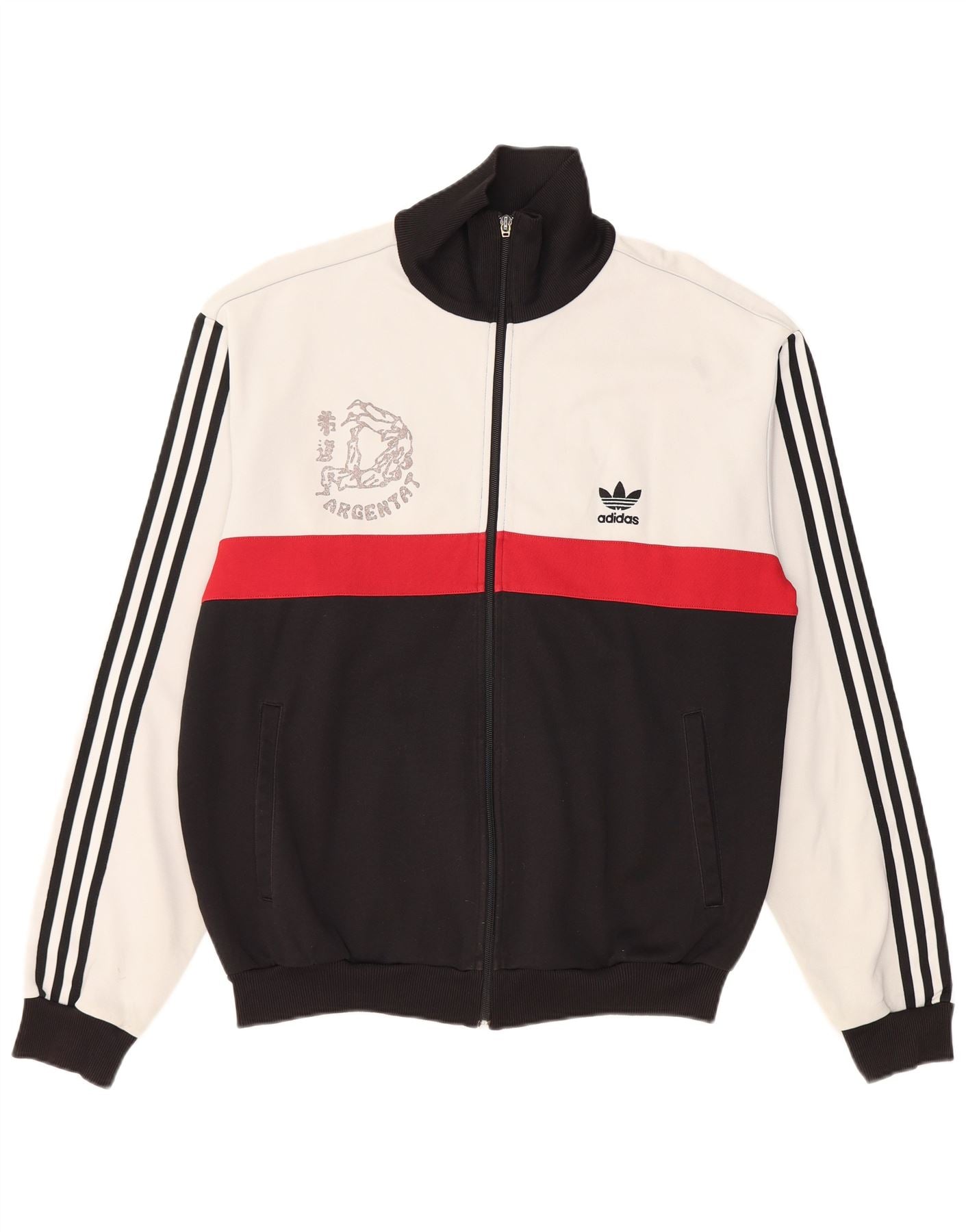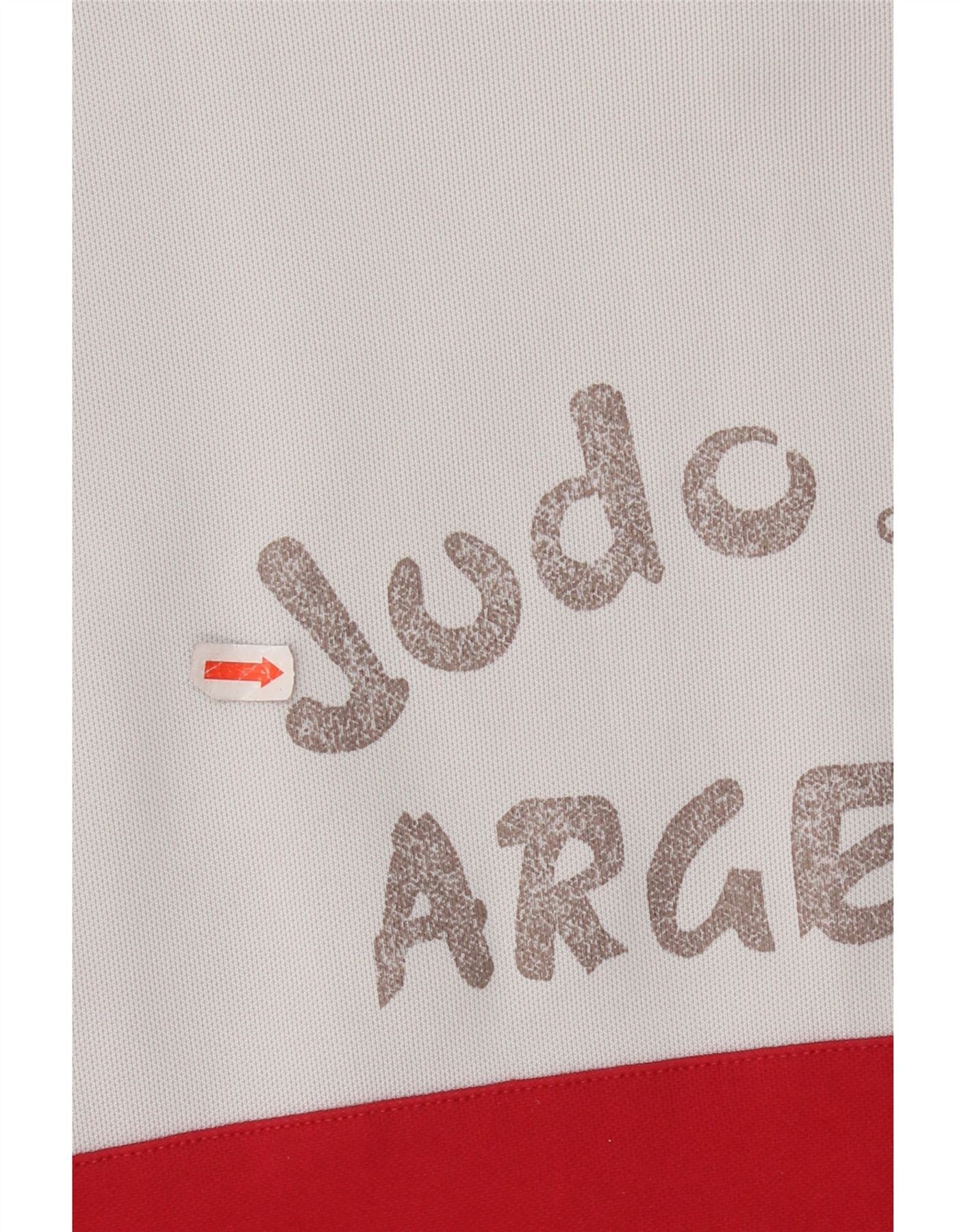 - Descrizione dell'IA: Questa giacca superiore della tuta da uomo Adidas è realizzata in un comodo tessuto misto cotone. Presenta un sorprendente design a blocchi di colore in bianco, nero e rosso. Lo scollo con colletto e la chiusura full zip offrono uno stile sportivo classico. Le maniche lunghe e la vestibilità regolare garantiscono facilità di movimento. Dettagli grafici per il Judo Club Argentat e il logo Adidas completano questo capo atletico.