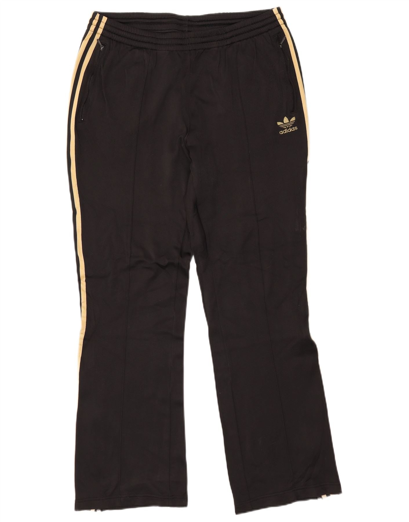 - Descrizione dell'IA: Questi pantaloni della tuta da donna Adidas sono realizzati in jersey nero liscio con una morbida fodera in pile. Presentano un comodo elastico in vita e una vestibilità regolare per facilitare i movimenti. Le cerniere alla caviglia offrono uno stile regolabile. Strisce dorate distintive scendono lungo ciascuna gamba, completate da un logo Adidas ricamato. Le pratiche tasche offrono comodità.