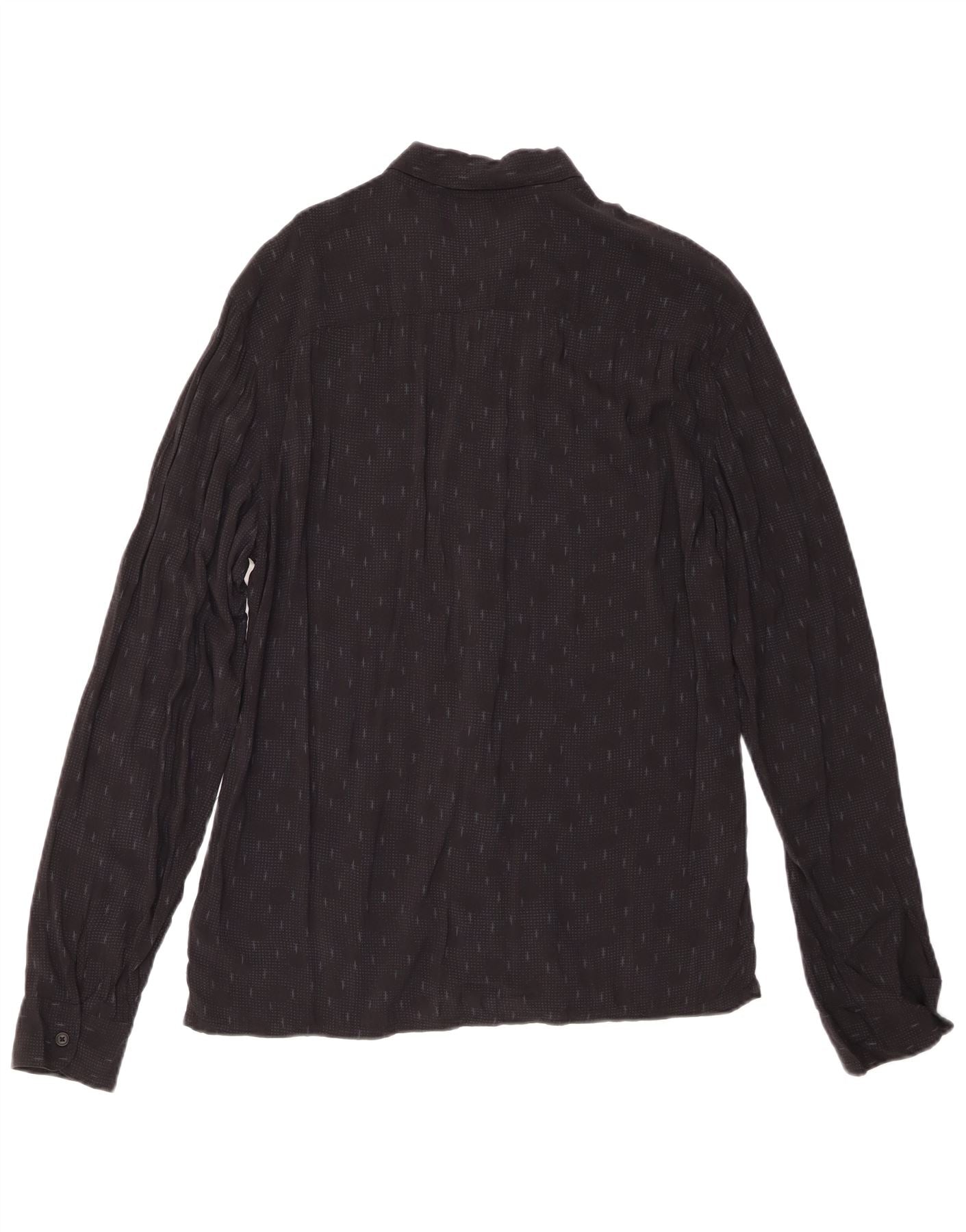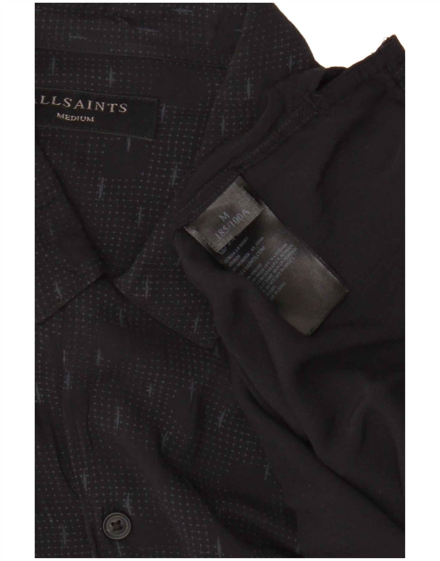 - Descrizione dell'IA: Questa camicia da uomo All Saints è realizzata in rayon nero leggero e traspirante. Presenta un sottile motivo geometrico ovunque. I bottoni tonali assicurano la chiusura frontale. Lo scollo con colletto e le maniche lunghe con risvolto offrono una struttura classica. Una vestibilità regolare garantisce un'usura confortevole.