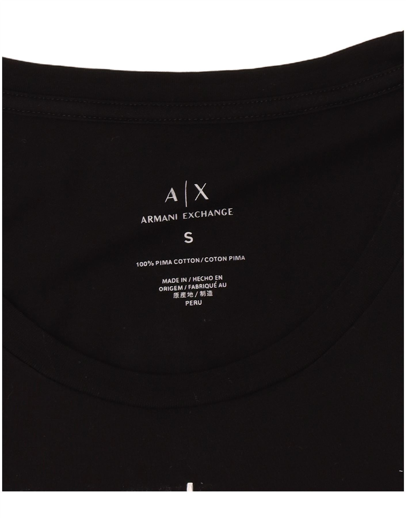 - Descrizione dell'IA: Questa maglietta grafica da donna di Armani Exchange è realizzata in morbido jersey di cotone Pima nero al 100%. Presenta un classico girocollo e maniche lunghe. La vestibilità regolare garantisce una vestibilità comoda. Un prominente logo bianco A|X Armani Exchange adorna la parte anteriore. Questo modello di pullover offre un'estetica pulita e moderna.