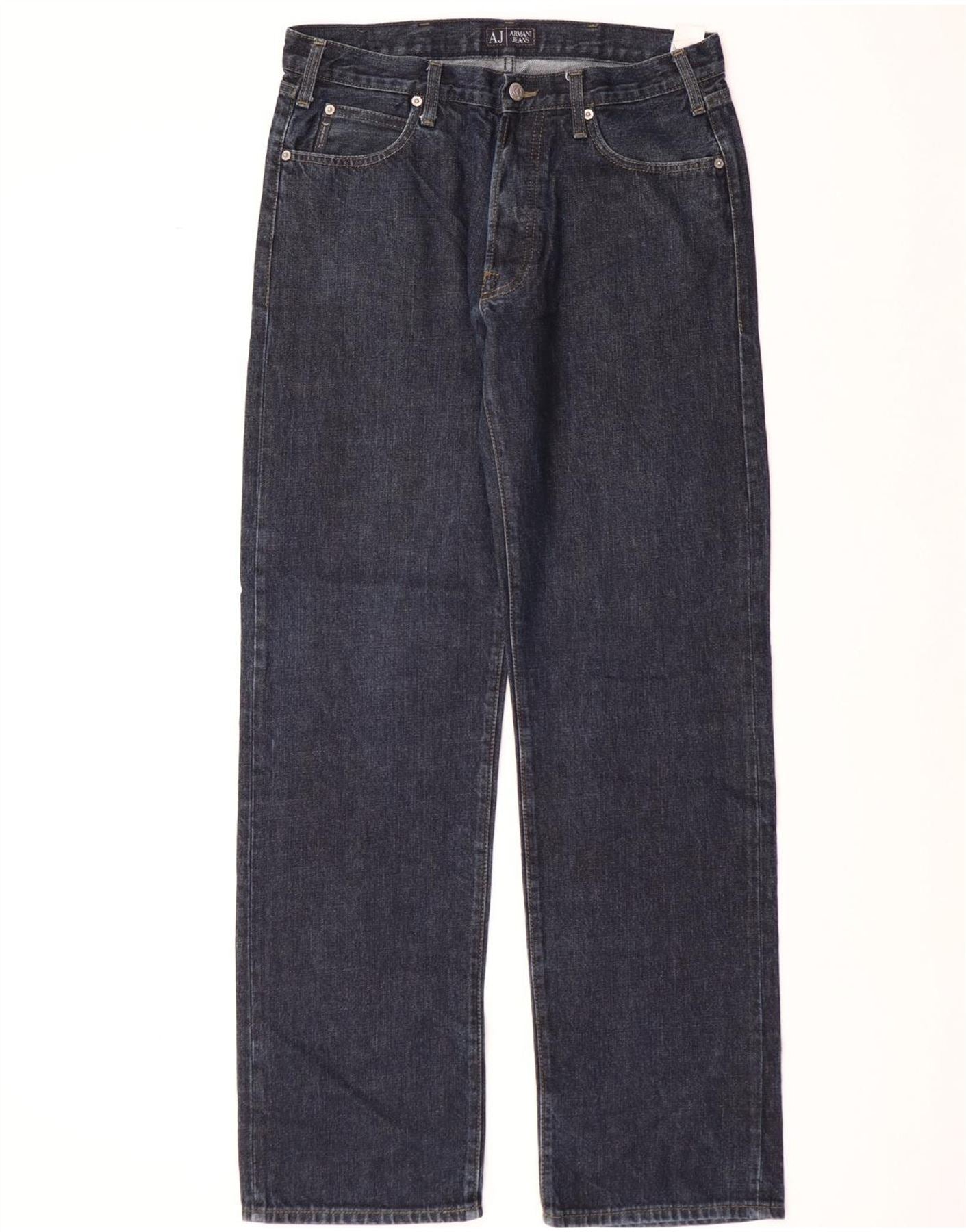 - AI Description: These Armani Jeans men's straight jeans are crafted from 100 percent cotton denim in a rich navy blue. They feature a classic straight leg and a regular fit for comfort. The button closure ensures a secure wear. Practical pockets are included, and a subtle logo accent adds brand recognition. This classic fit offers timeless style and versatility.