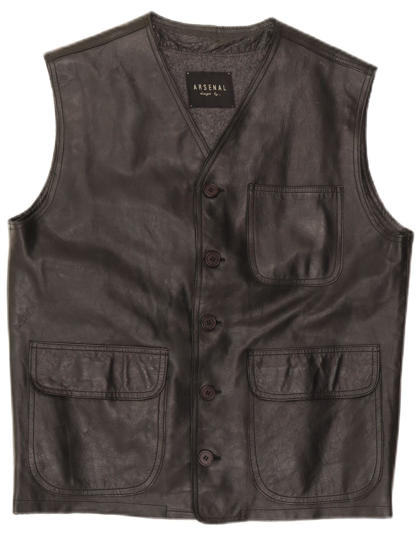 - Descrizione dell'IA: Questo gilet da uomo dell'Arsenal è realizzato in pelle nera liscia. Presenta un classico scollo a V e un'abbottonatura frontale. Il design senza maniche offre una vestibilità regolare. Le pratiche tasche frontali aggiungono dettagli funzionali. I pulsanti tonali completano lo stile classico.