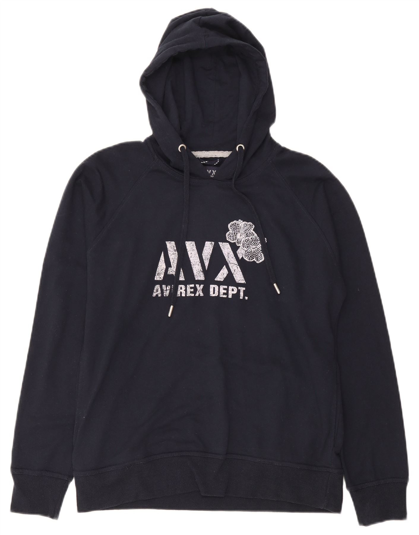 Home > Abbigliamento Avirex vintage > Da donna > Maglione con cappuccio grafico da donna Avirex UK 14 cotone medio blu navy