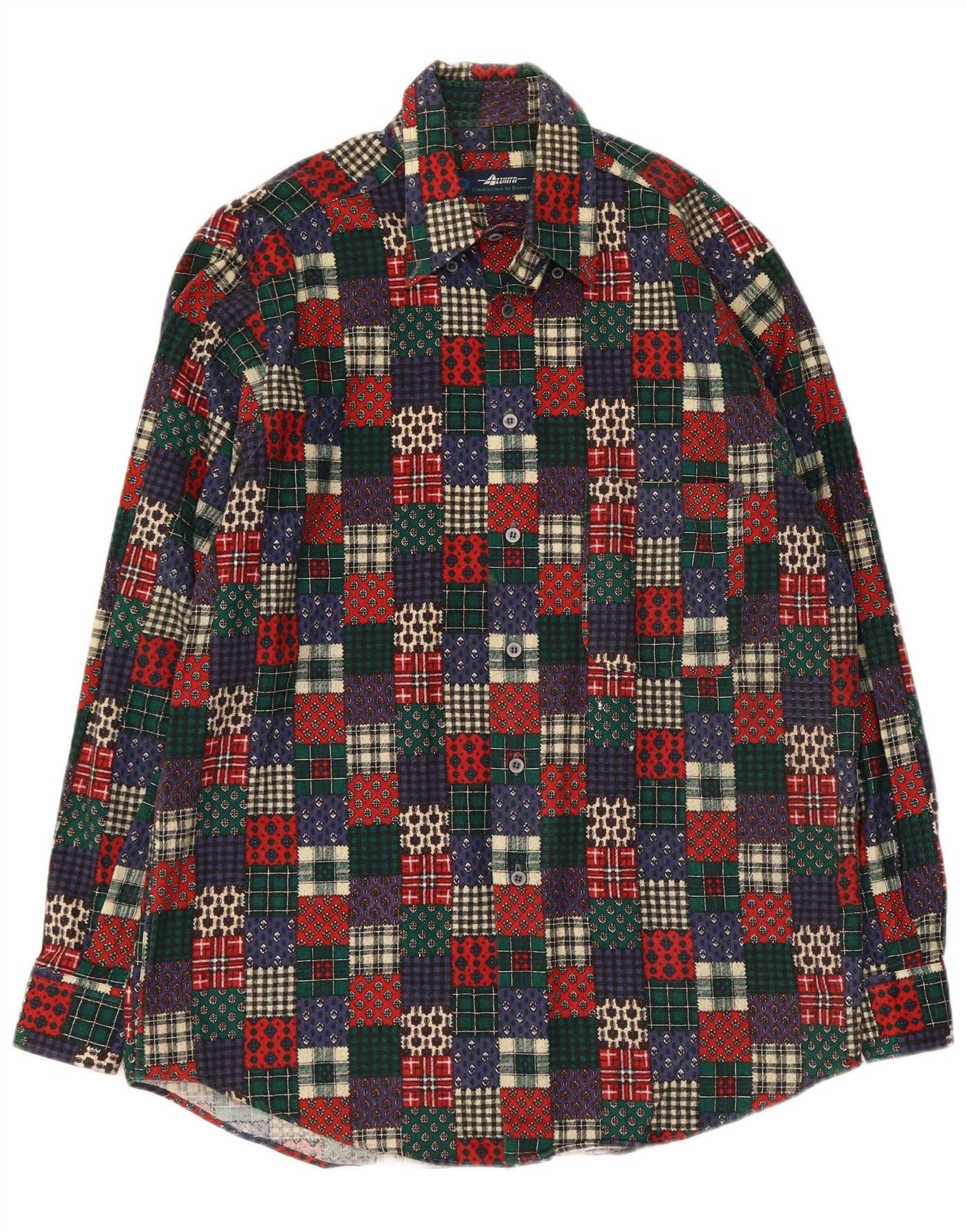 - Descrizione dell'IA: Questa camicia da uomo in flanella Compagnia Di Bandiere è realizzata al 100% in cotone con una trama morbida. Presenta un vivace motivo patchwork multicolore, che combina tonalità rosse, verdi e blu. Lo scollo con colletto e l'abbottonatura frontale completa offrono una struttura classica. Le maniche lunghe con dettagli con risvolto completano il design. La sua vestibilità regolare garantisce un'usura confortevole, incarnando uno stile retrò con un interesse visivo distintivo.
