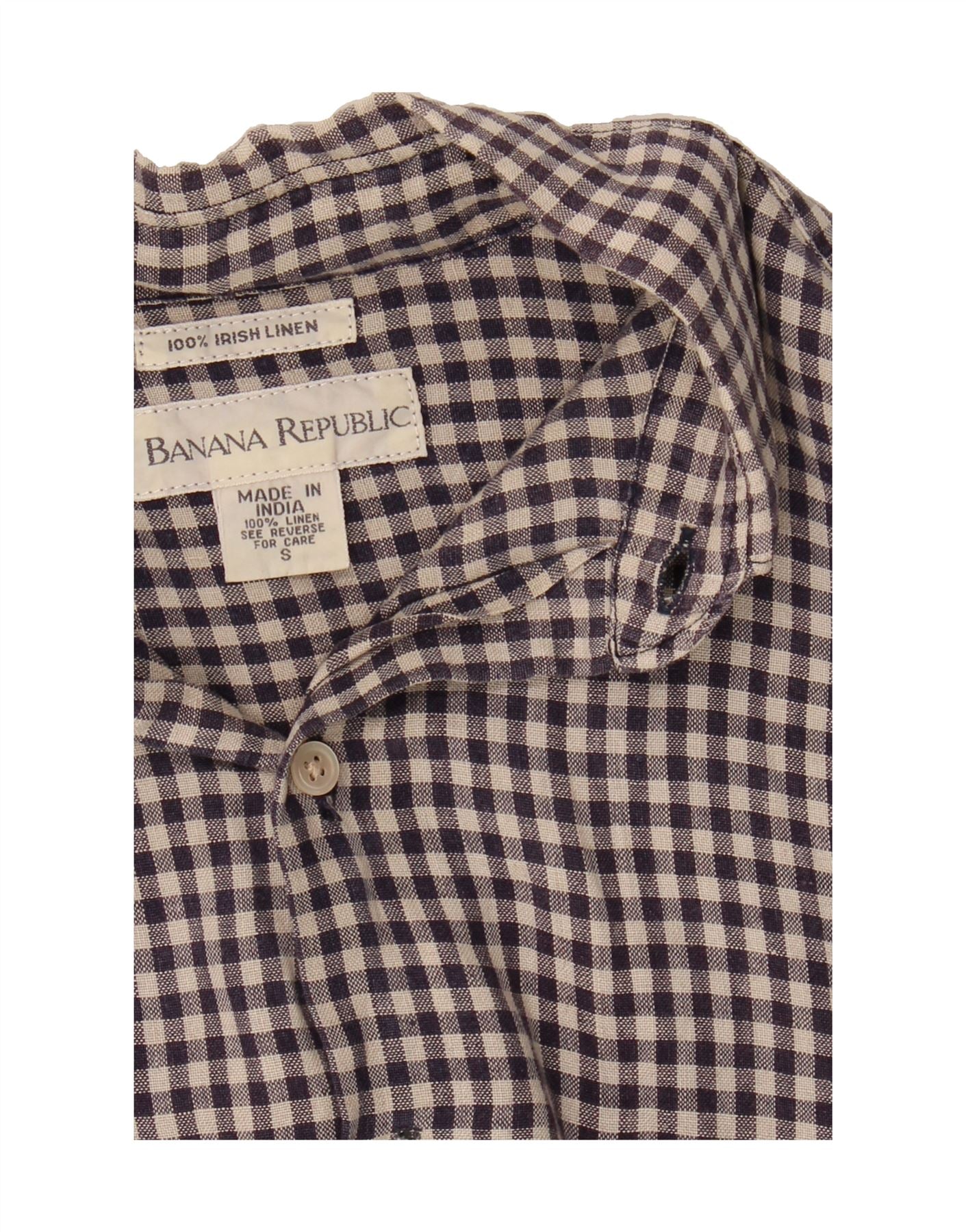 - AI Description: This Banana Republic men's shirt is crafted from 100% Irish linen in a classic blue check pattern. The long-sleeved, collared shirt features a regular fit and button closure. With a woven fabric and cuffed sleeves, it offers both comfort and style. It includes pockets and is labelled size S. This pre-owned shirt is in excellent condition, with only minor loose stitching on the collar. Made in India, please refer to the care label for washing instructions.
