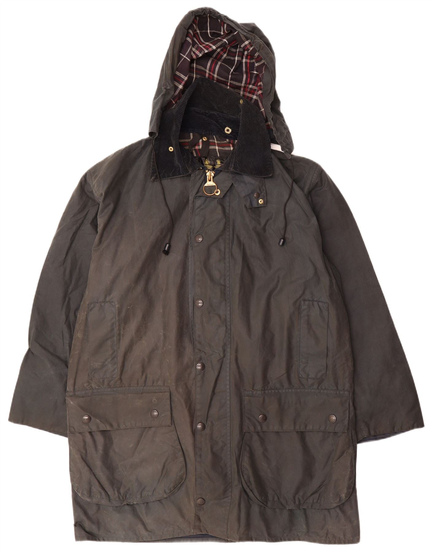 - AI Description: This Barbour mens waxed cotton jacket is crafted from a durable green waxed cotton blend, offering water resistance. It features a classic collared neckline and long sleeves. The regular fit ensures comfortable wear. A button closure secures the front, complemented by practical pockets and a hood. The interior reveals a traditional plaid pattern. This timeless piece combines functionality with classic British style.
