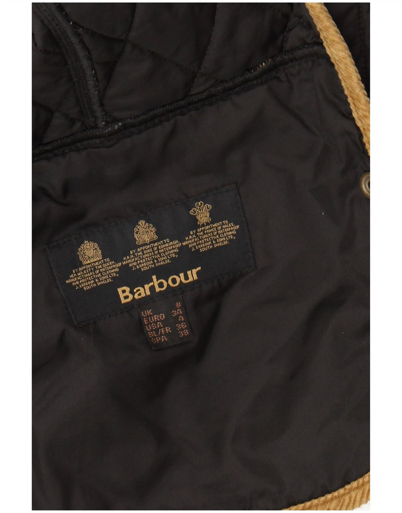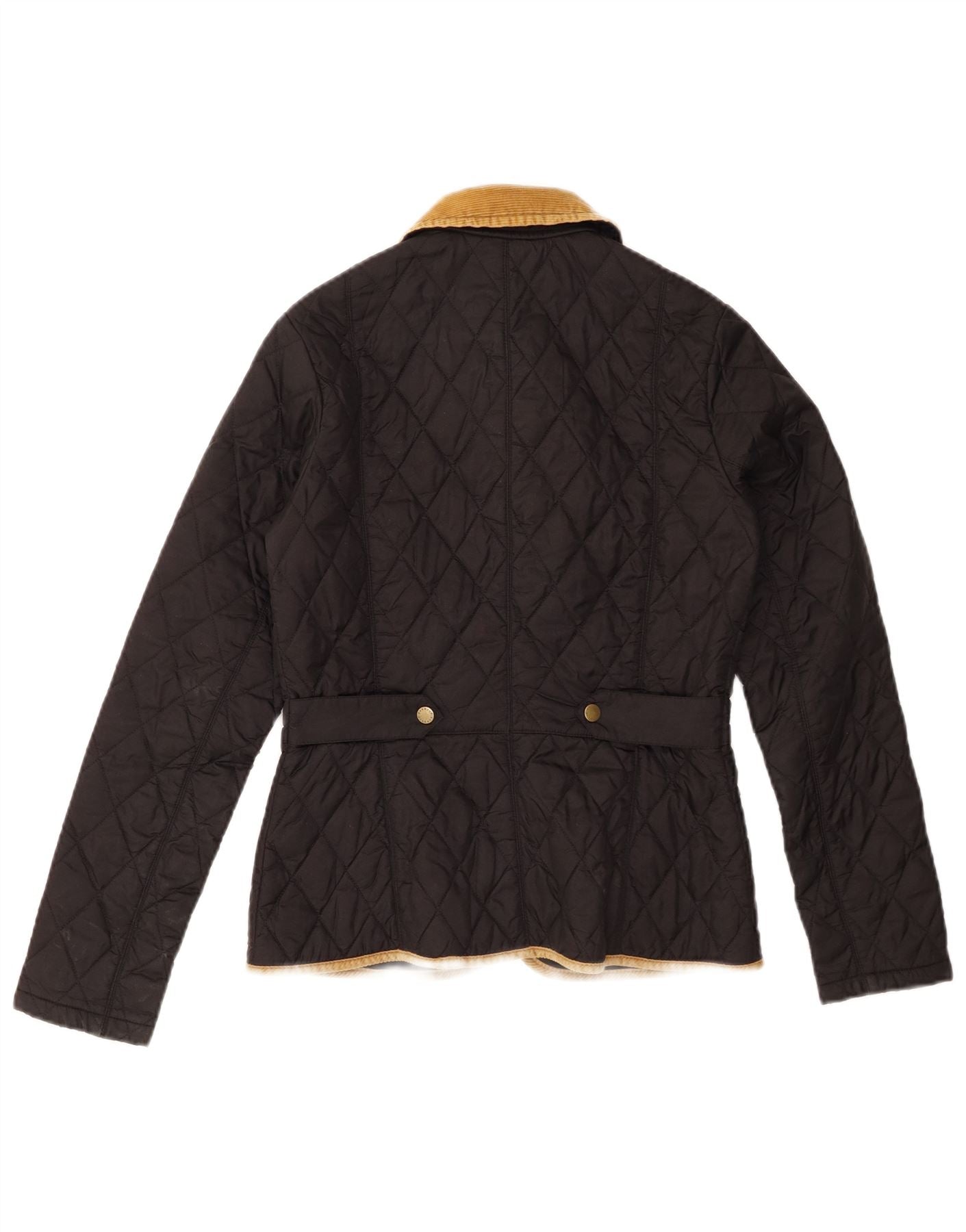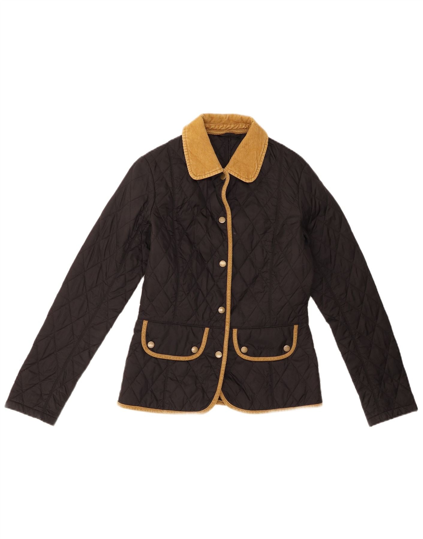 - AI Description: This Barbour womens quilted jacket comes in a classic black finish. It features a woven fabric with corduroy accents, offering a refined texture. The collared neckline and long sleeves provide a traditional silhouette. An argyle diamond pattern adds a sophisticated touch. Button closures and an adjustable waist enhance its classic style. Practical pockets complete the design, ensuring a regular fit for comfortable wear.
