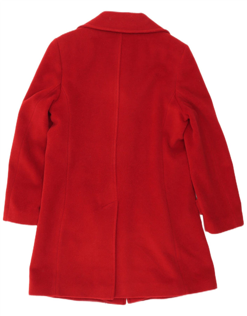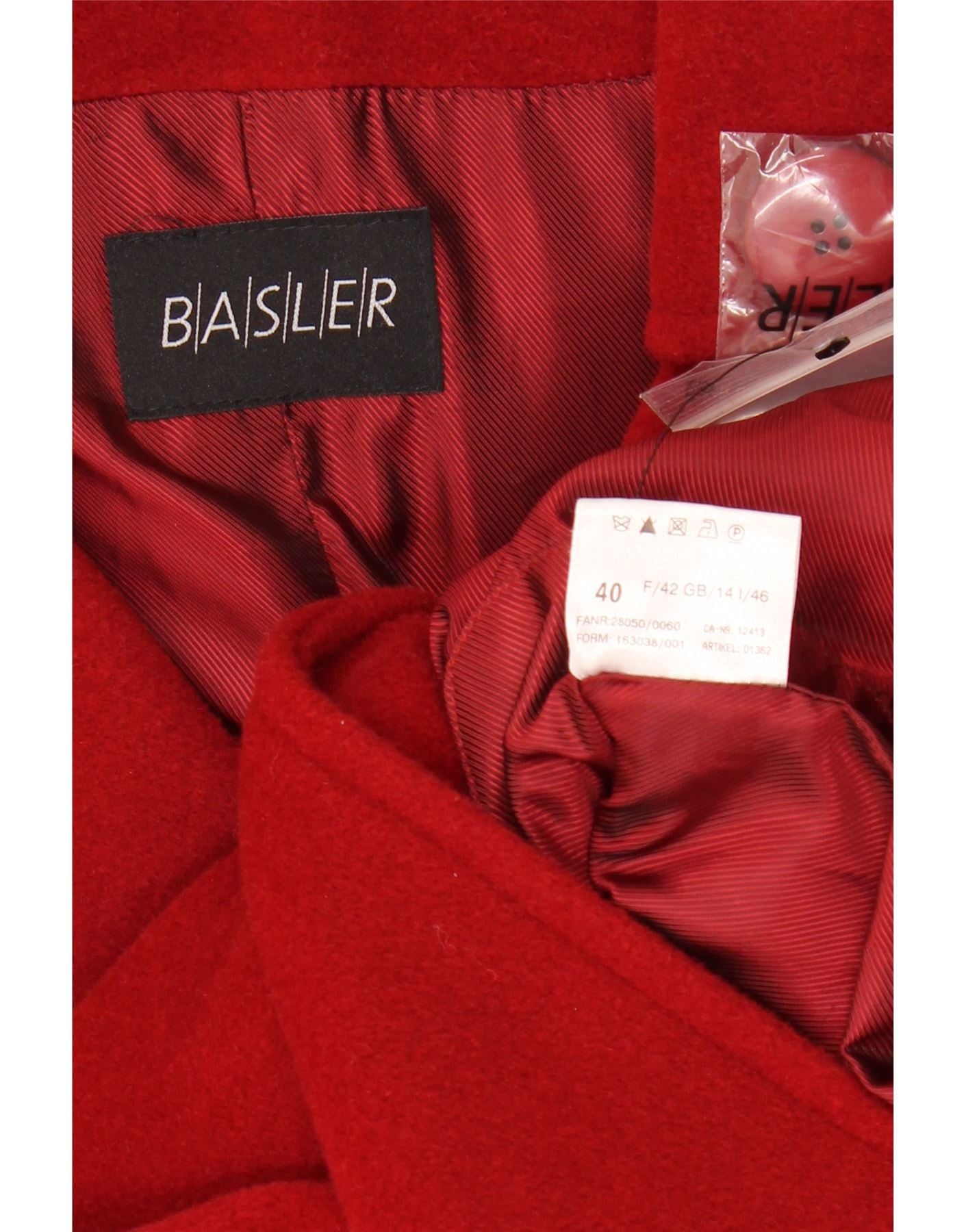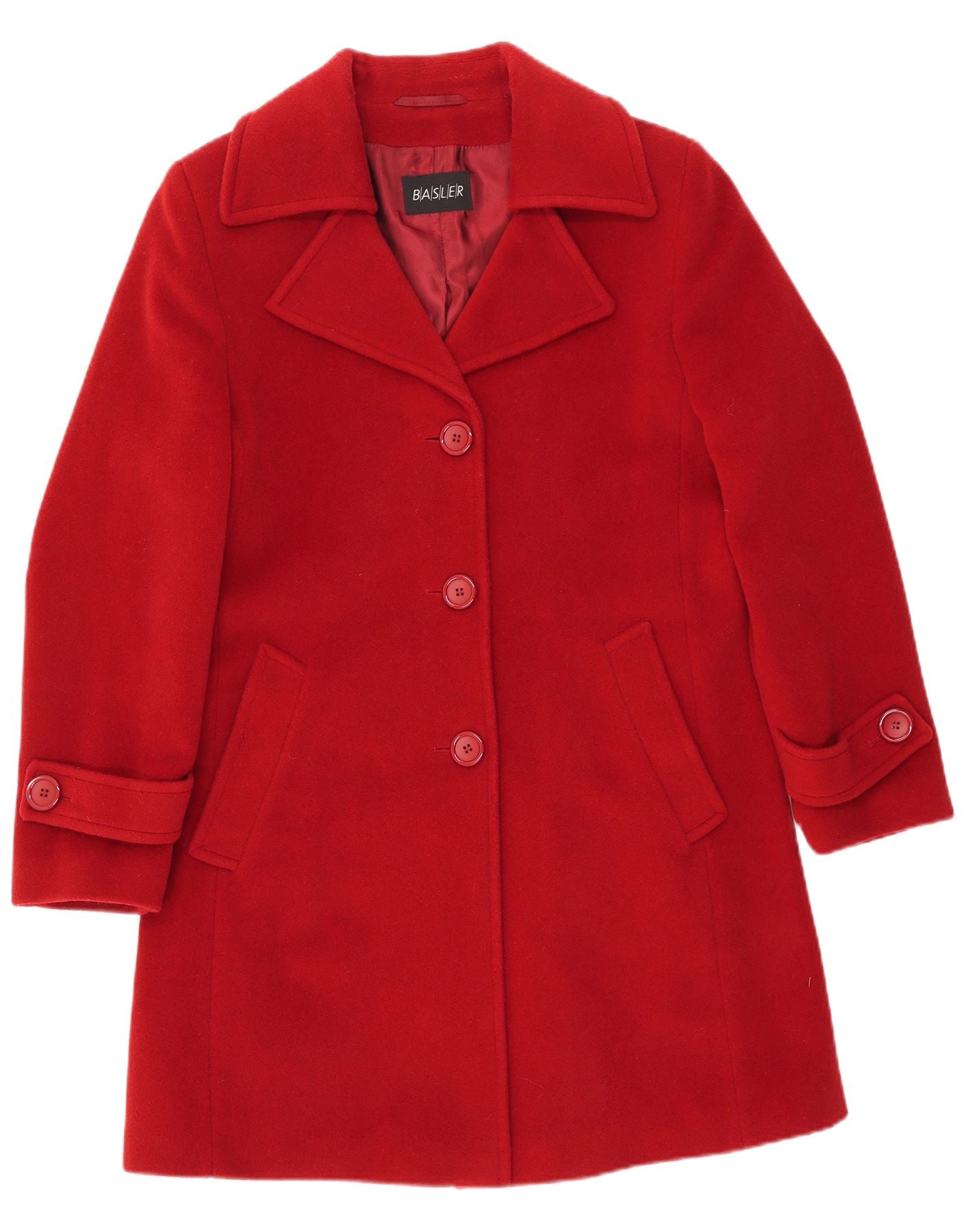 - AI Description: This Basler womens coat is crafted from rich red woven wool, offering a luxurious texture. It features a classic collared neckline and long sleeves. The front is secured with a three-button closure, complemented by functional pockets. Its regular fit offers a timeless silhouette, embodying classic elegance, perfect for sophisticated layering.