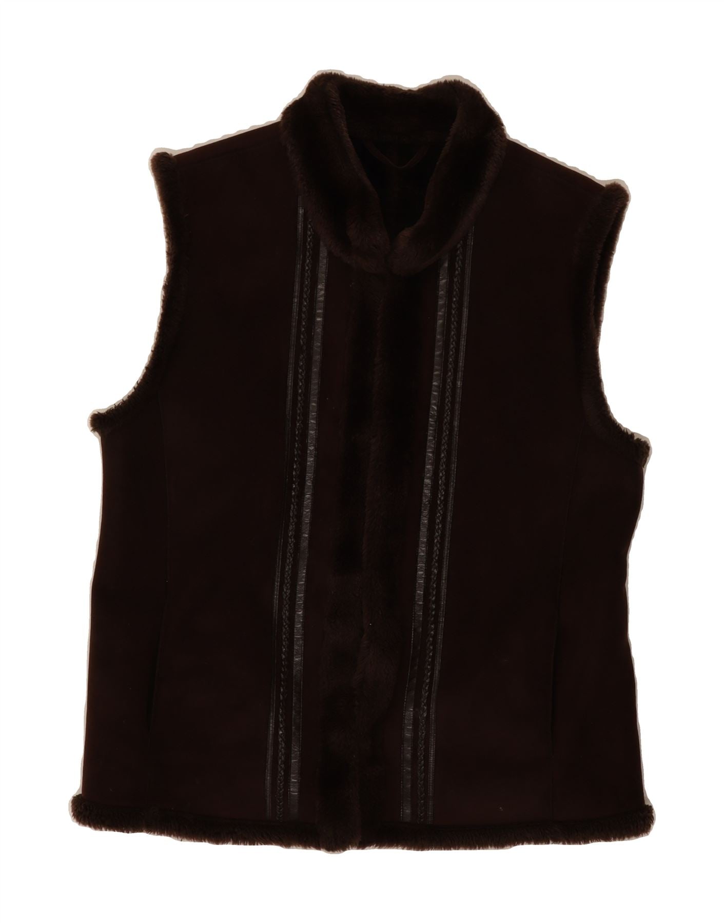 - AI Description: Elevate your wardrobe with this pre-owned, excellent condition Basler waistcoat. Crafted from brown shearling suede leather, this classic style offers a regular fit and collared neckline. Features include a button closure, fur trim accent, pockets, and full lining. A versatile sleeveless piece, size 42, perfect for adding a touch of sophistication to any outfit.