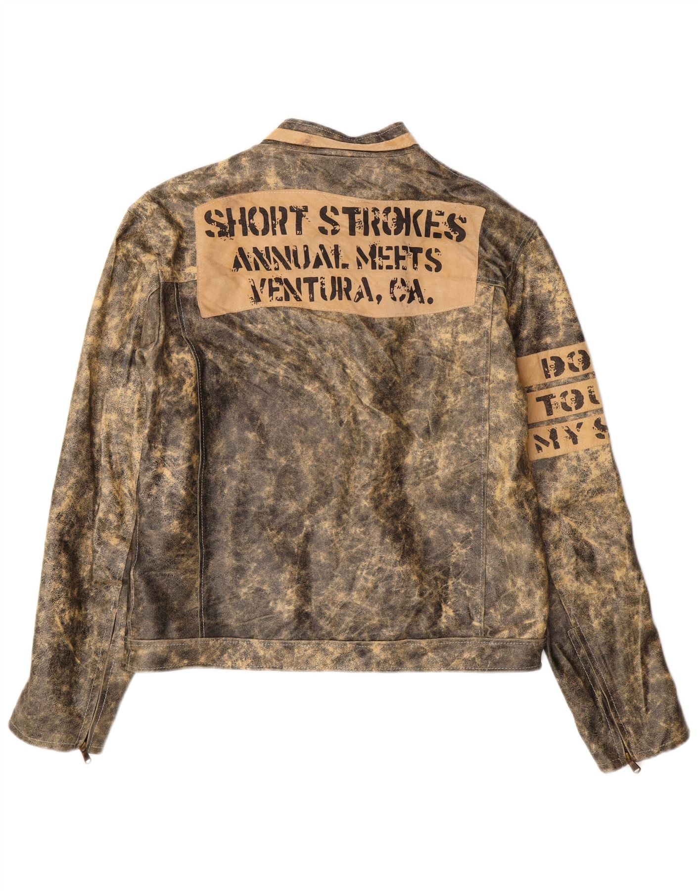 - Descrizione dell'IA: Questa giacca da motociclista da uomo vintage è realizzata in pelle multicolore invecchiata, offrendo una texture unica e usurata. Presenta uno scollo con colletto e una chiusura full zip per una classica silhouette da motociclista. Le maniche lunghe e la vestibilità regolare garantiscono un'usura confortevole. I dettagli grafici sulle maniche e sul retro aggiungono un tocco distintivo e audace. Pratiche tasche completano il design.