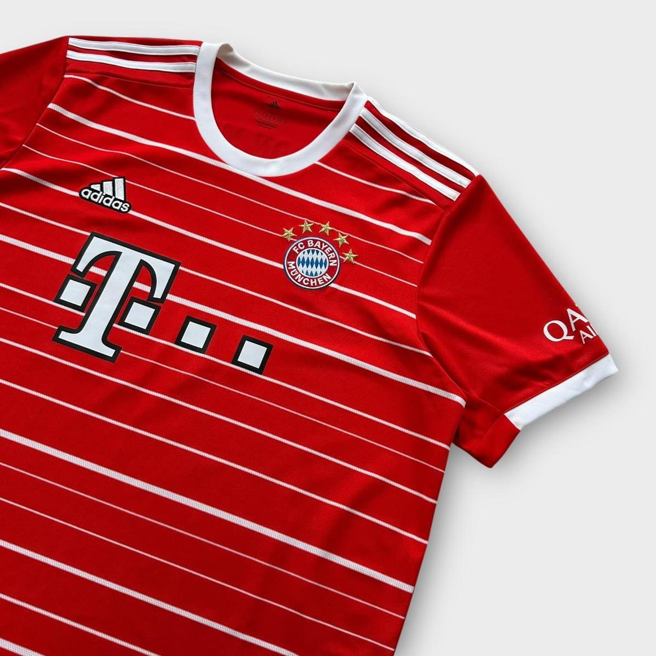 Maglia da calcio home del Bayern Monaco della stagione 2022/2023 di Adidas con loghi ricamati e sponsor T-Mobile sul petto. Sul retro è impresso il nome del giocatore "Musiala 42".
