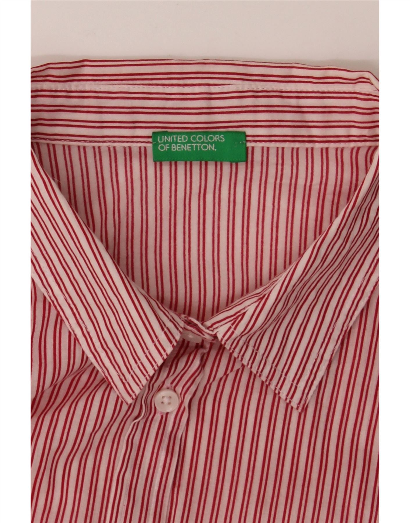 - AI Description: This pre-owned United Colors of Benetton shirt is a classic, long-sleeved design in red. Featuring a collared neckline and button closure, the regular fit shirt showcases a checked pattern with striped detailing. Accented with buttons, it includes pockets and cuffed sleeves. Signs of minor visible wear are present overall. Recommended retail price: £15.00.