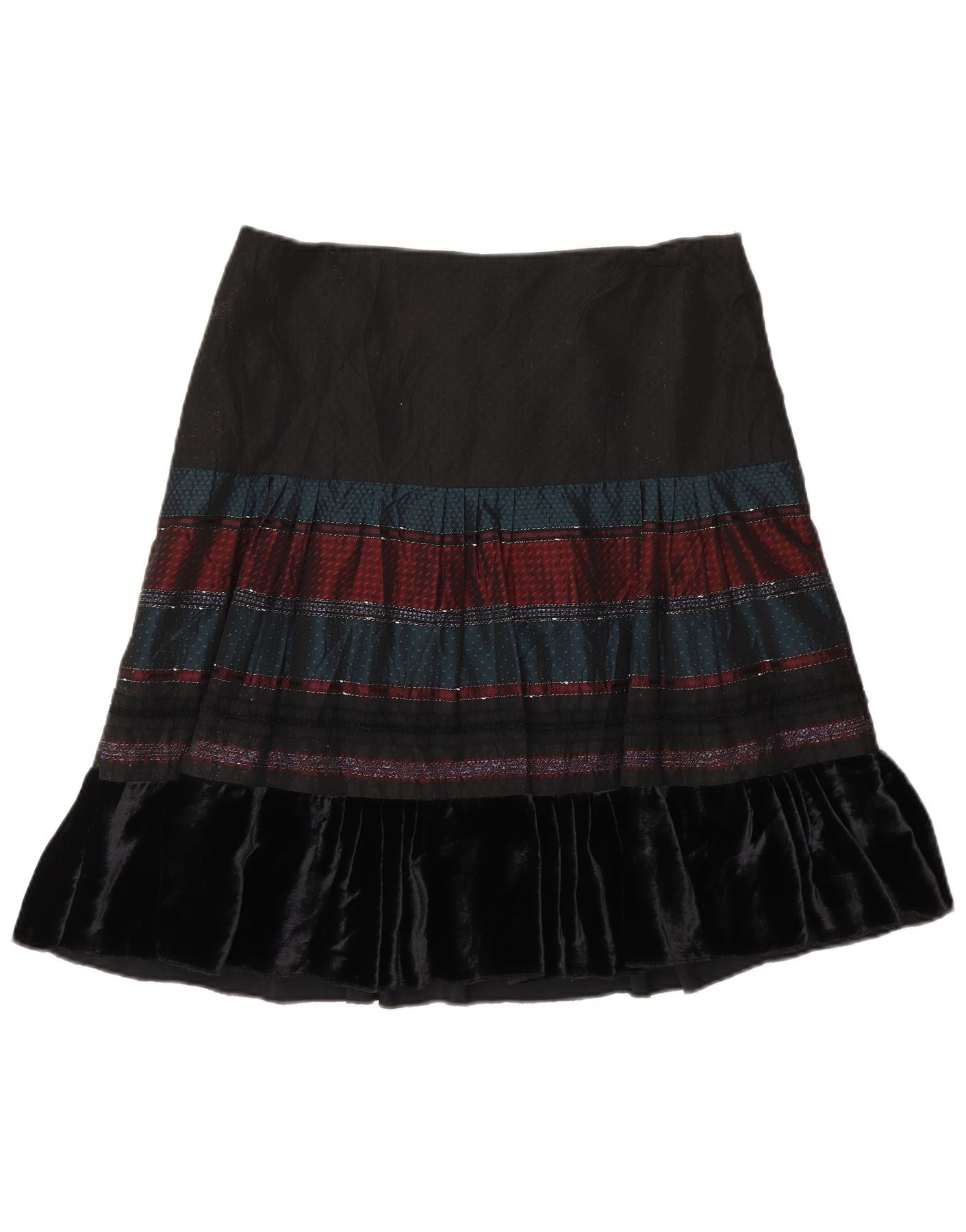 - Descrizione dell'IA: Questa gonna svasata da donna Under Colors Of Benetton presenta un comodo design da indossare. La sezione superiore nera conduce a un sorprendente motivo geometrico in tonalità ricche. Una lussuosa volant in velluto accentua l'orlo, aggiungendo un tocco di fascino bohémien. La vestibilità regolare e la silhouette svasata assicurano un movimento aggraziato. Questa gonna offre stile e comfort.