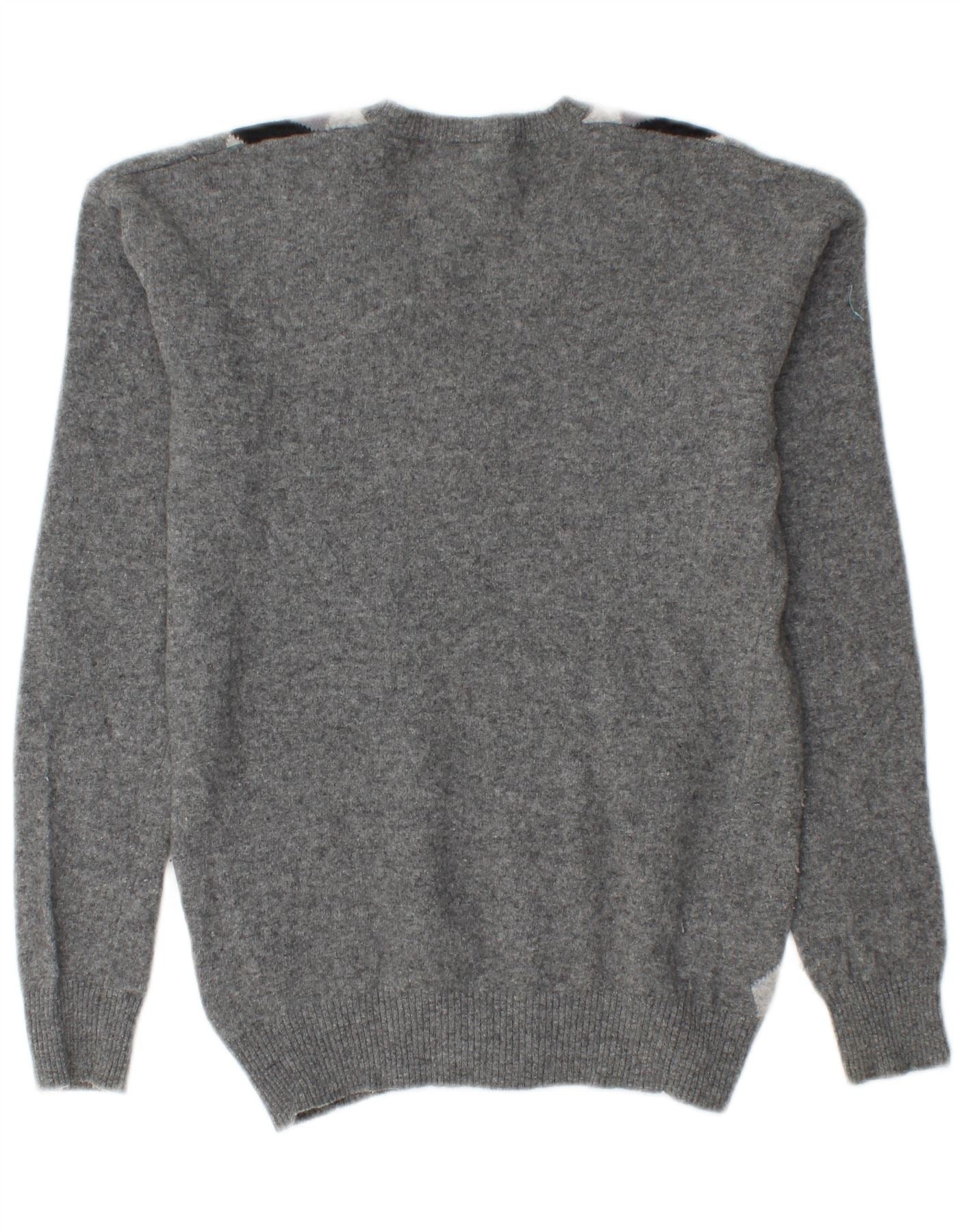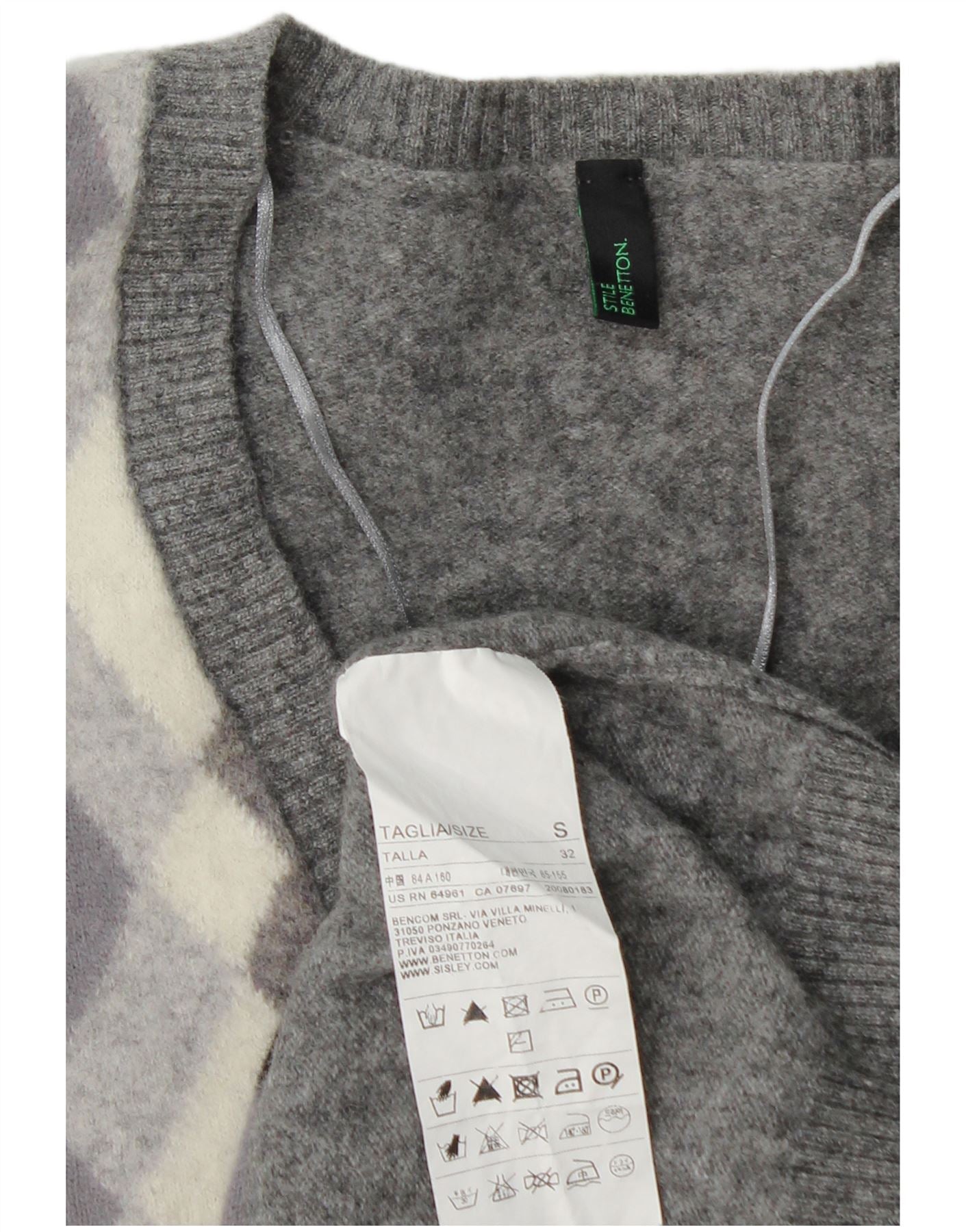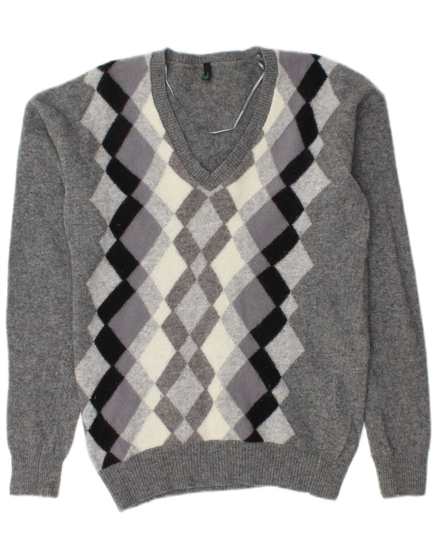 BENETTON Maglione da donna con scollo a V UK 10 Small Grigio Argyle/Diamond Wool