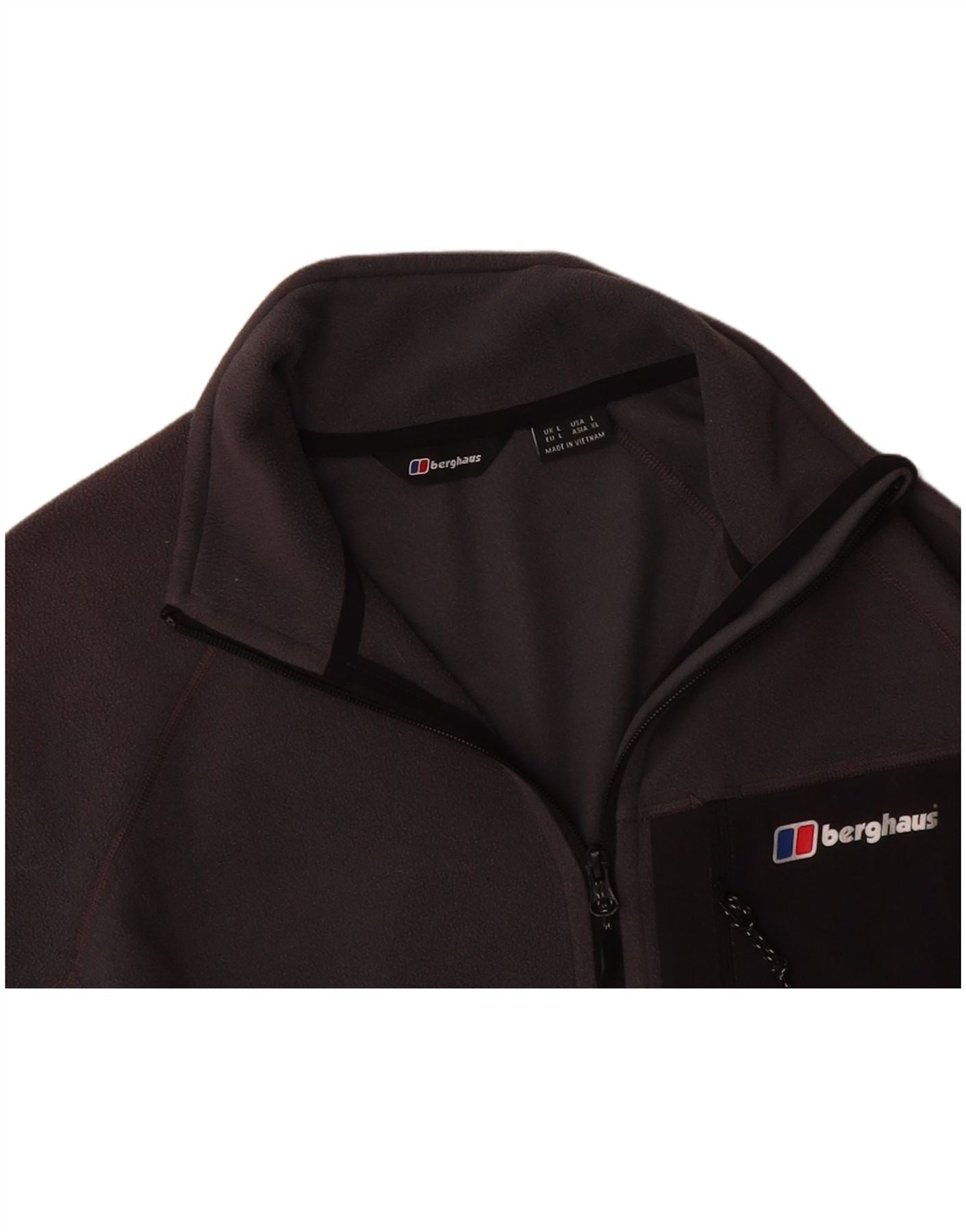 - AI Description: This Berghaus mens fleece jacket is crafted from soft grey fleece fabric. It features a collared neckline and long sleeves. The full zip closure extends to the neck. A regular fit ensures comfortable wear. Zipped pockets offer practical storage. Its lightweight design makes it ideal for sports and outdoor activities.