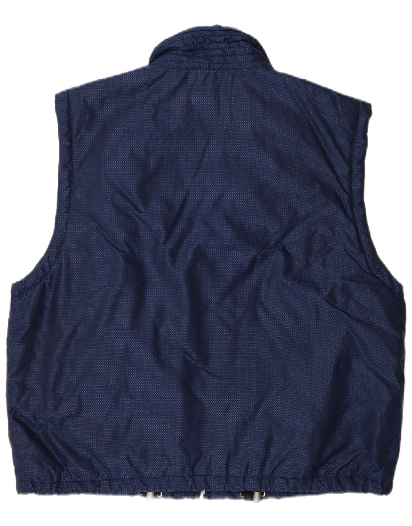 - Descrizione dell'IA: Questo gilet da uomo vintage è realizzato in tessuto blu navy e offre un design leggero e antivento. Presenta uno scollo con colletto e una chiusura full zip per praticità. Il taglio senza maniche offre un'eccellente libertà di movimento. Una vestibilità regolare garantisce un'usura confortevole. Il tessuto presenta un sottile motivo screziato, che aggiunge interesse visivo. Le tasche con cerniera offrono spazio sicuro. Un dettaglio del logo ricamato completa il look.