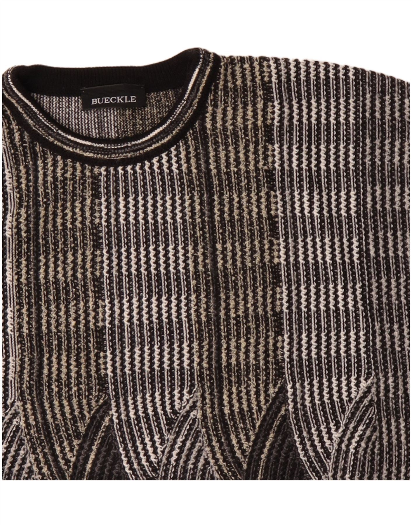 - Descrizione dell'IA: Questo maglione girocollo da uomo Bueckle è realizzato in un comodo tessuto a maglia. Presenta un sorprendente motivo geometrico nei toni del nero, bianco e oro delicato. Lo scollo rotondo e le maniche lunghe offrono una silhouette classica. I polsini e l'orlo con risvolto forniscono una finitura ordinata. Progettato per una vestibilità regolare, assicura comfort e facilità di indossabilità. Questo maglione unisce uno stile retrò con un fascino moderno.