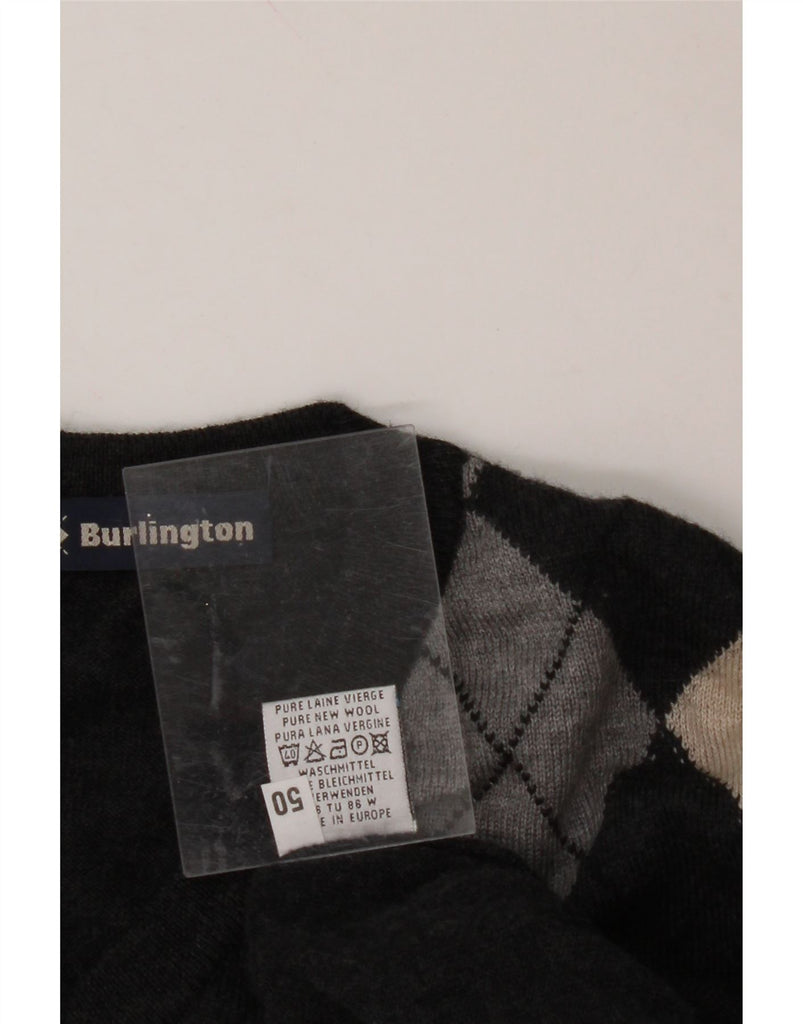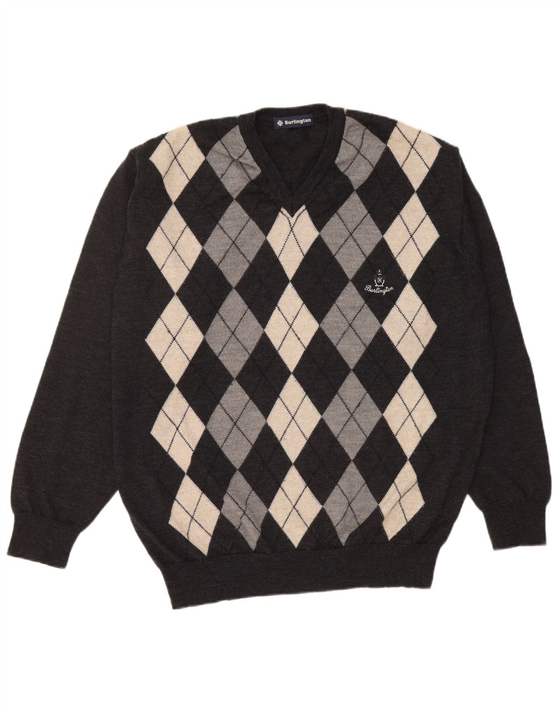 BURLINGTON Mens V-Neck Jumper Sweater IT 50 Medium Grey Argyle/Diamond
