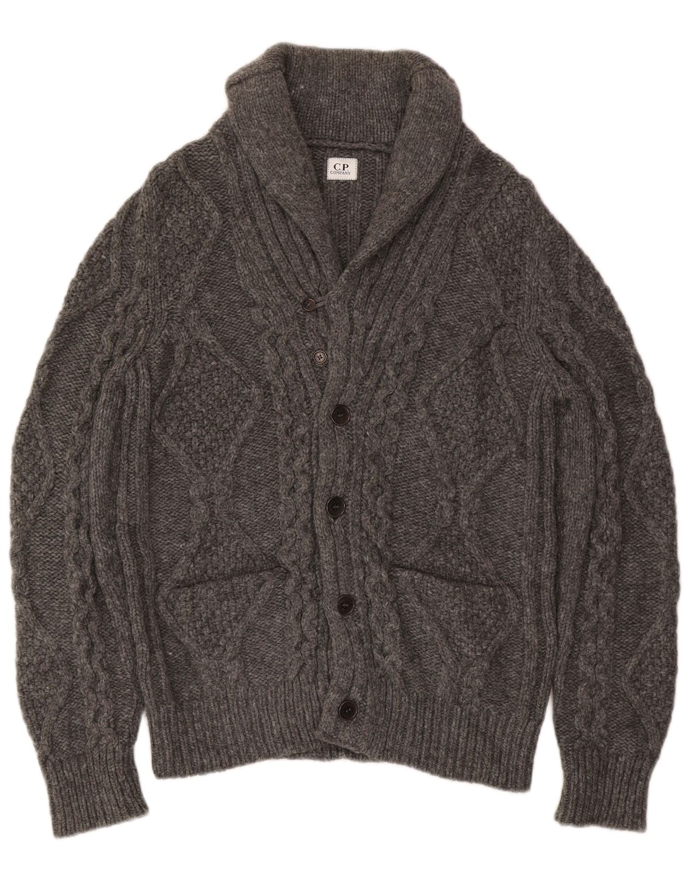 - AI Description: This C.P. Company men's cardigan is crafted from a luxurious virgin wool and alpaca blend knit. It features a distinguished shawl neck and a classic button-up front. Long sleeves and a regular fit ensure comfortable wear. The design includes practical pockets and subtle button accents. Its grey colour offers versatile styling. This classic piece combines warmth with refined style.