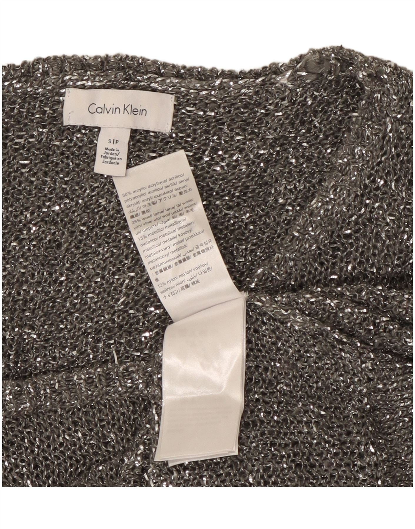 - Descrizione dell'IA: Questa maglietta da donna Calvin Klein è realizzata in misto maglia grigia, con fili metallici per una sottile finitura glitterata. Presenta un classico scollo rotondo e comode maniche corte. La vestibilità rilassata assicura facilità di indossabilità e una silhouette moderna. I dettagli metallici forniscono uno scintillio contemporaneo, perfetto per uno stile versatile.