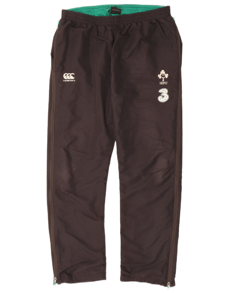- AI Description: These Canterbury mens tracksuit trousers are crafted from a durable woven fabric, offering windproof protection. The pull-on design features an elastic waist for a comfortable, secure fit. A regular fit ensures ease of movement, ideal for active wear. Practical pockets provide storage, while ankle zips allow for adjustable ventilation and easy changing. Subtle IRFU branding completes the athletic design.