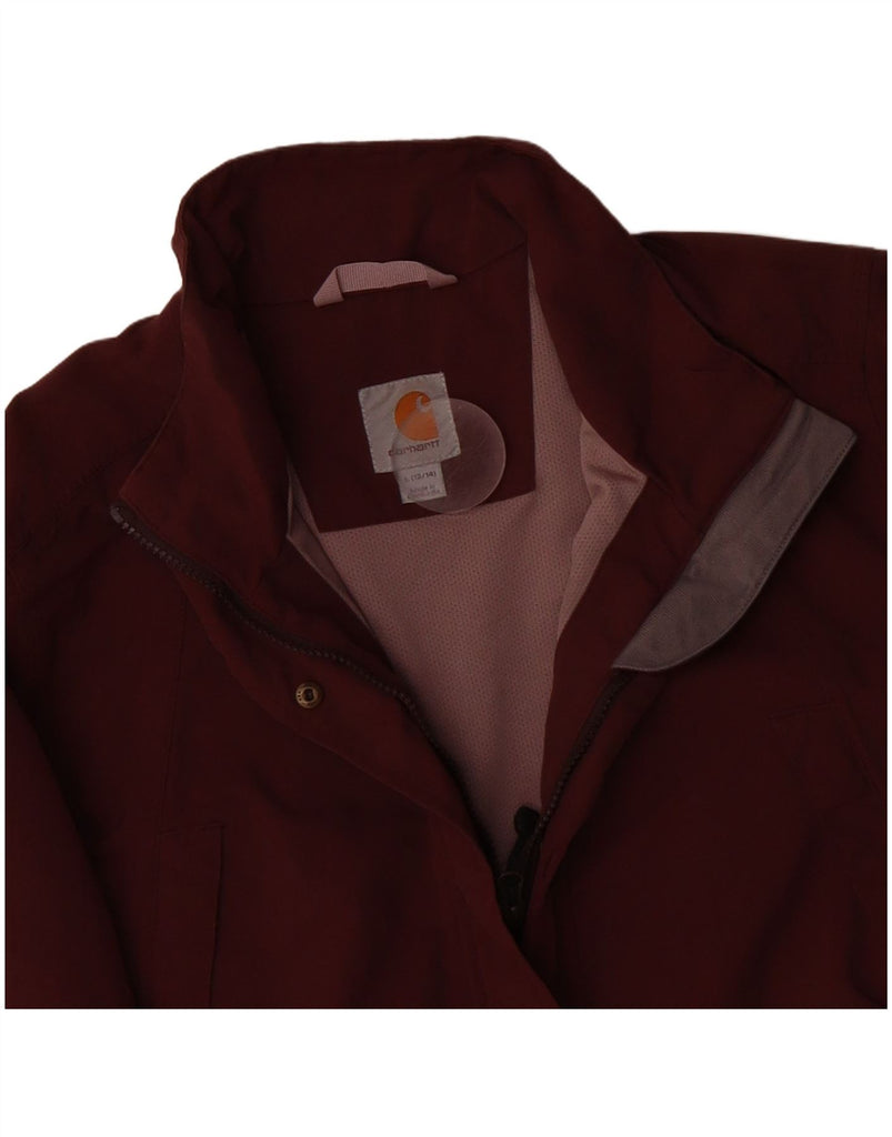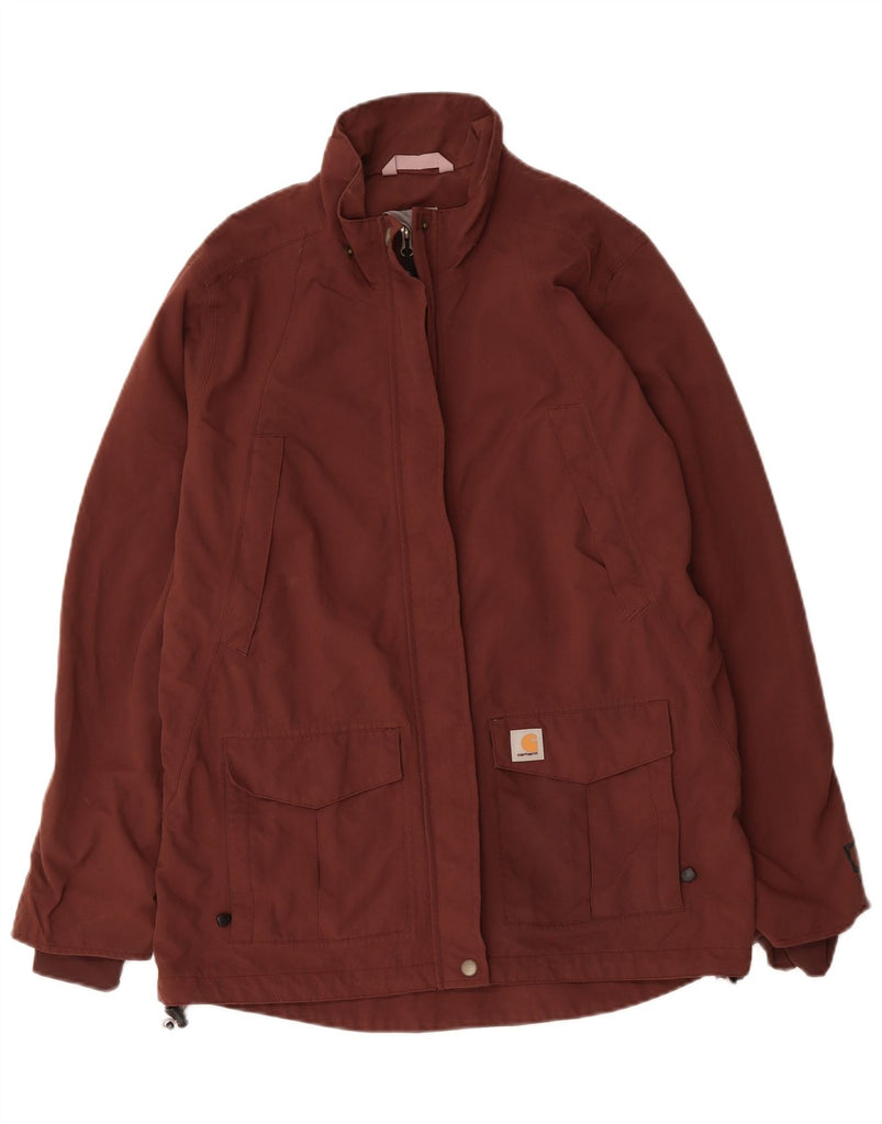 - AI Description: This Carhartt womens Utility Jacket is crafted from durable burgundy canvas, offering a heavyweight feel. It features a classic collared neckline and long sleeves. The regular fit ensures comfortable wear. A full zip closure provides practicality. Multiple pockets add functionality. An adjustable design enhances versatility. A subtle logo accent completes the classic style.