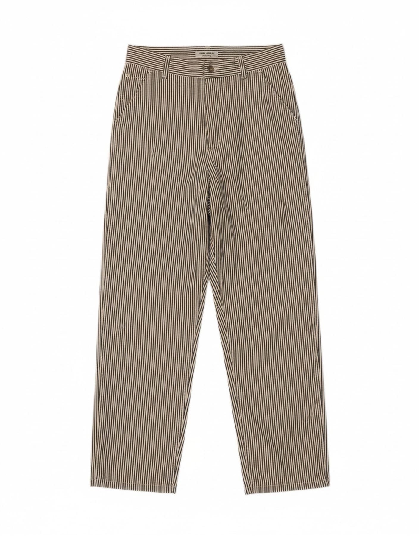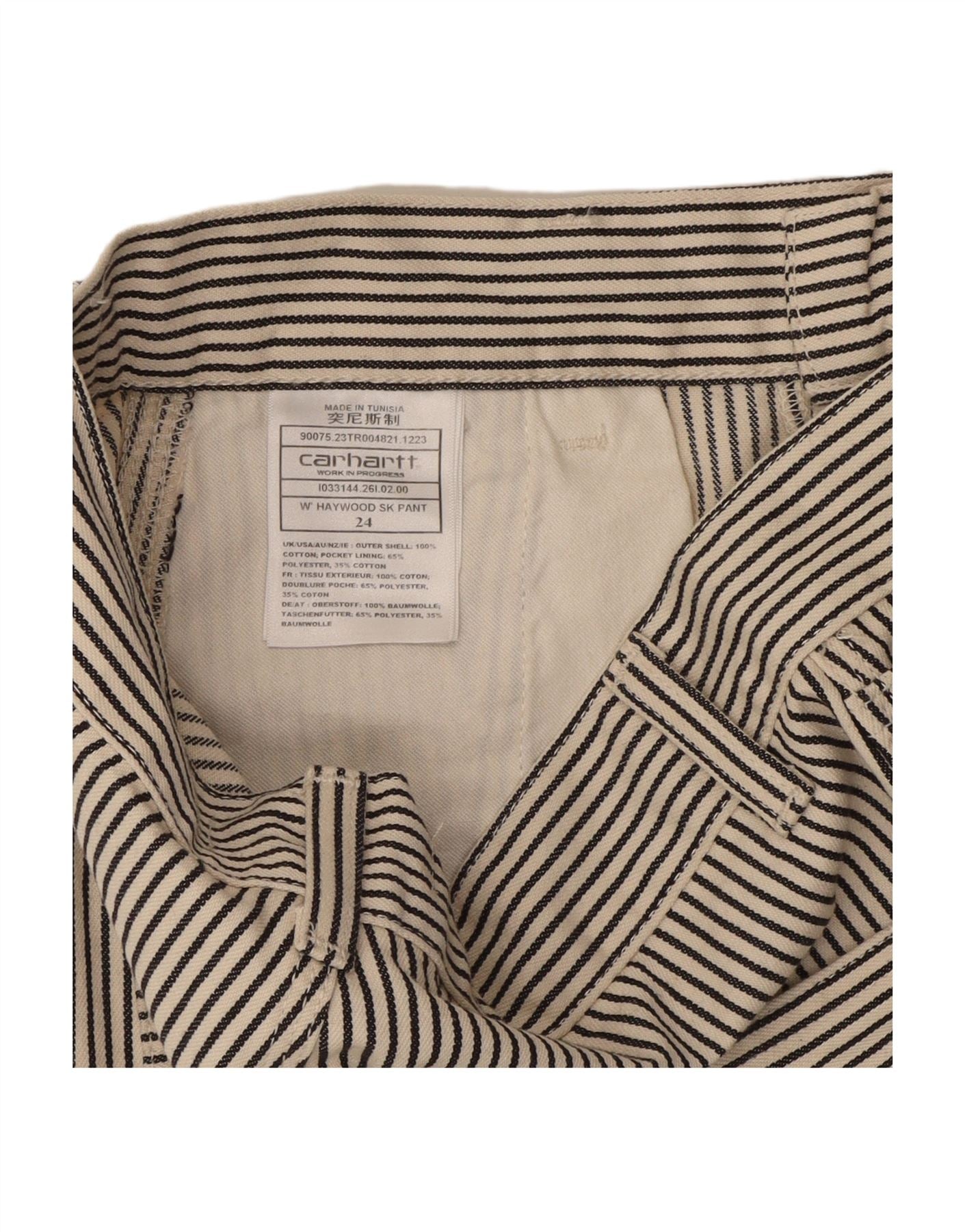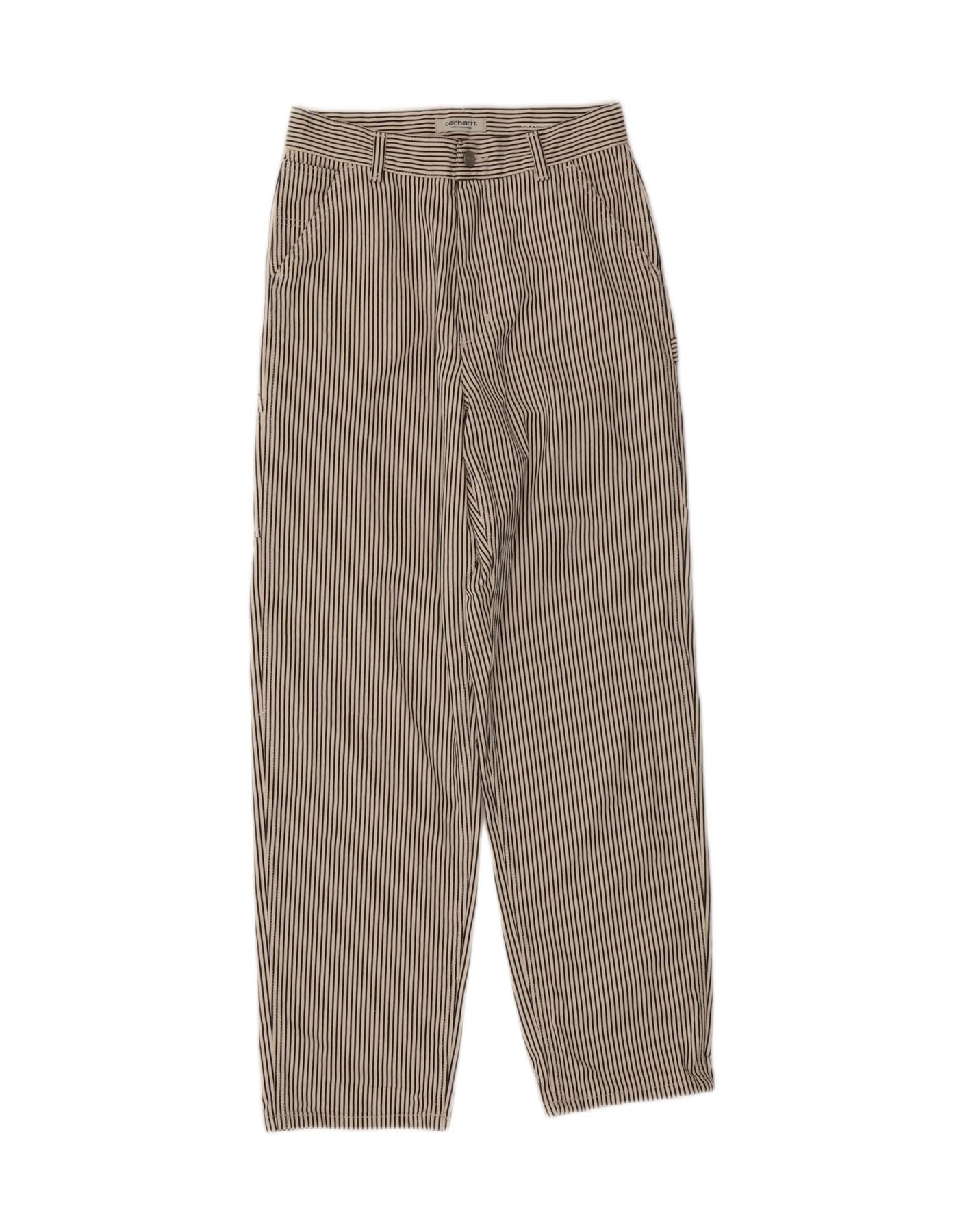 - AI Description: This Carhartt womens cropped trousers are crafted from 100 cotton woven fabric. They feature a vibrant multicoloured striped pattern offering a distinctive look. A regular fit ensures comfortable wear perfect for everyday style. The mid-rise waist coupled with a secure button and zip closure creates a flattering silhouette. Practical pockets complete this functional design.