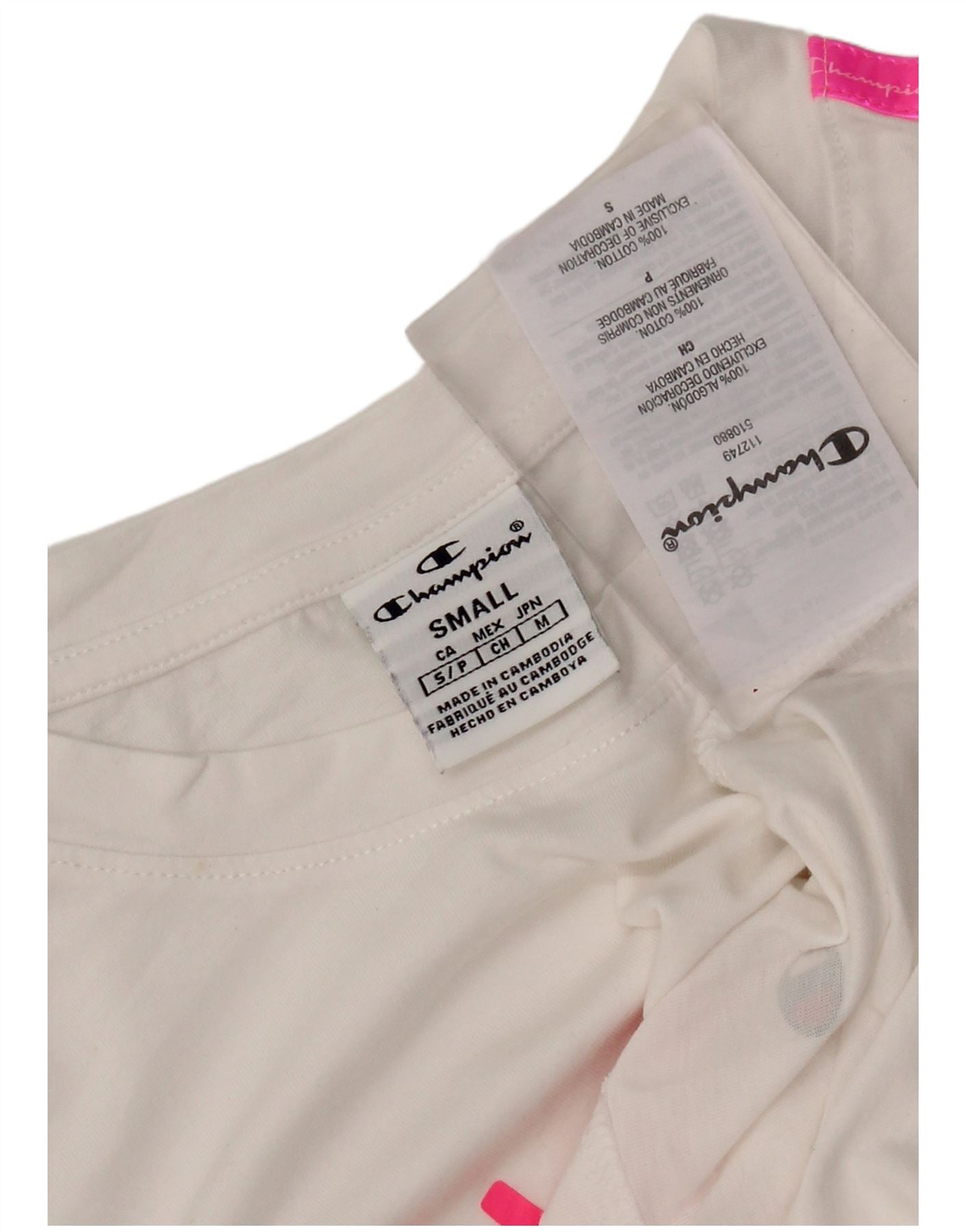 Home > Abbigliamento da campione vintage > Da donna > Magliette > T-shirt grafica corta da donna Champion Top UK 10 Small White Colourblock