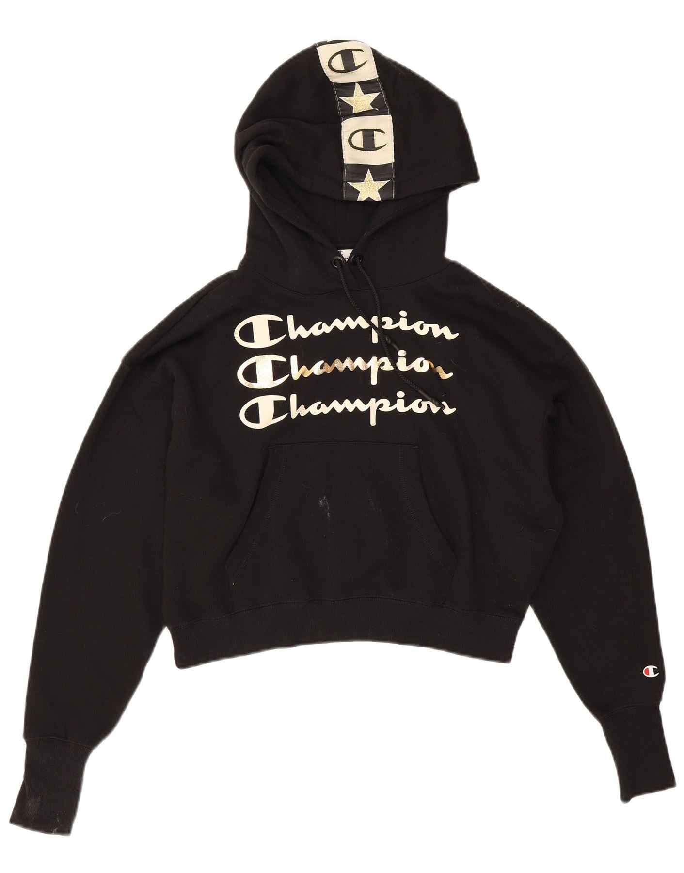 Home > Abbigliamento da campione vintage > Da donna > Felpa > Felpa con cappuccio grafica corta oversize da donna Champion UK 10 piccola nera