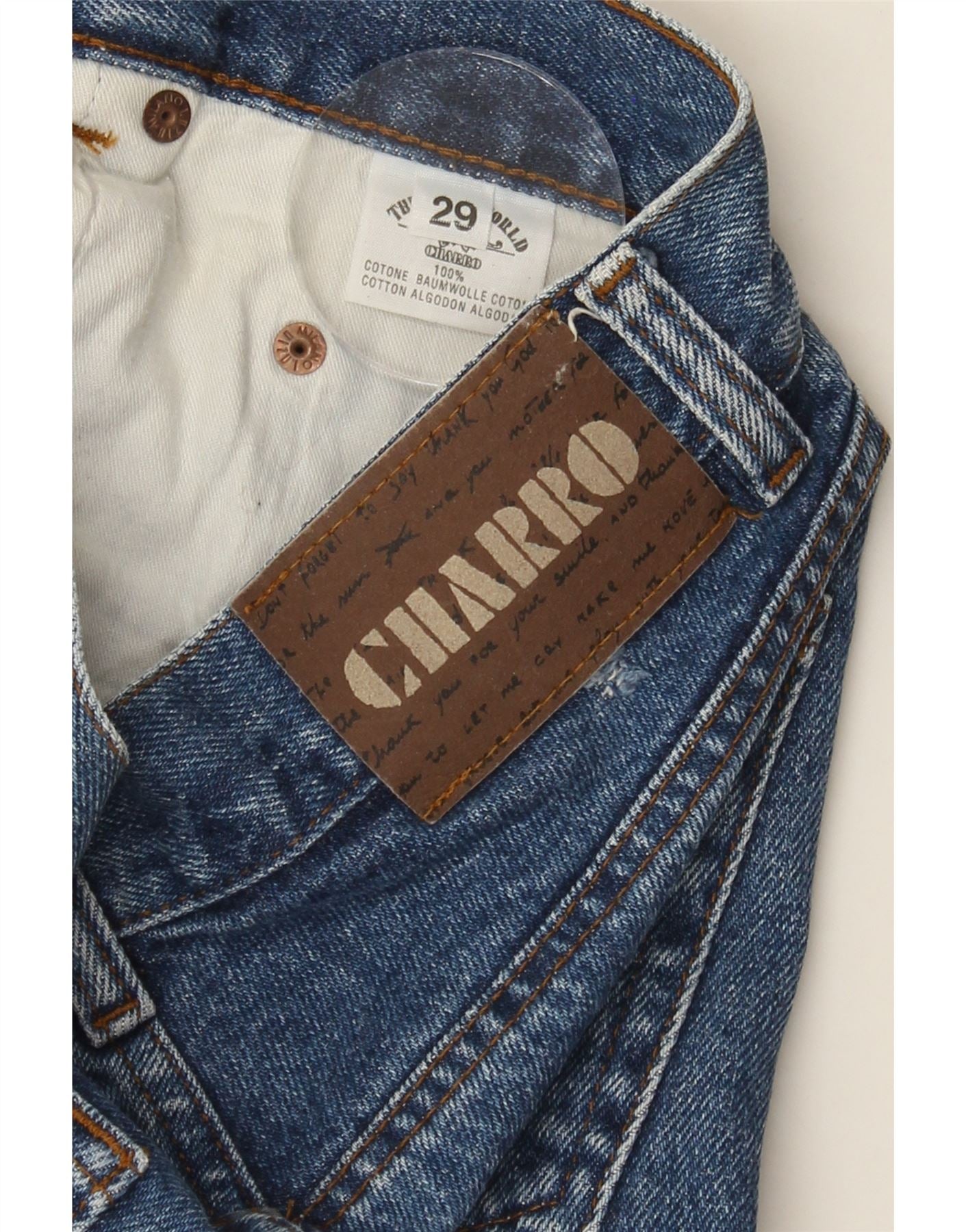 - AI Description: These pre-owned Charro jeans offer a touch of 90s style. Crafted from durable denim in a classic blue hue, these women's jeans are made from 100% cotton for ultimate comfort. Featuring a regular fit with a button closure and practical pockets, they also boast a button accent. Size 29. Condition is good, with minor visible wear including fading throughout.