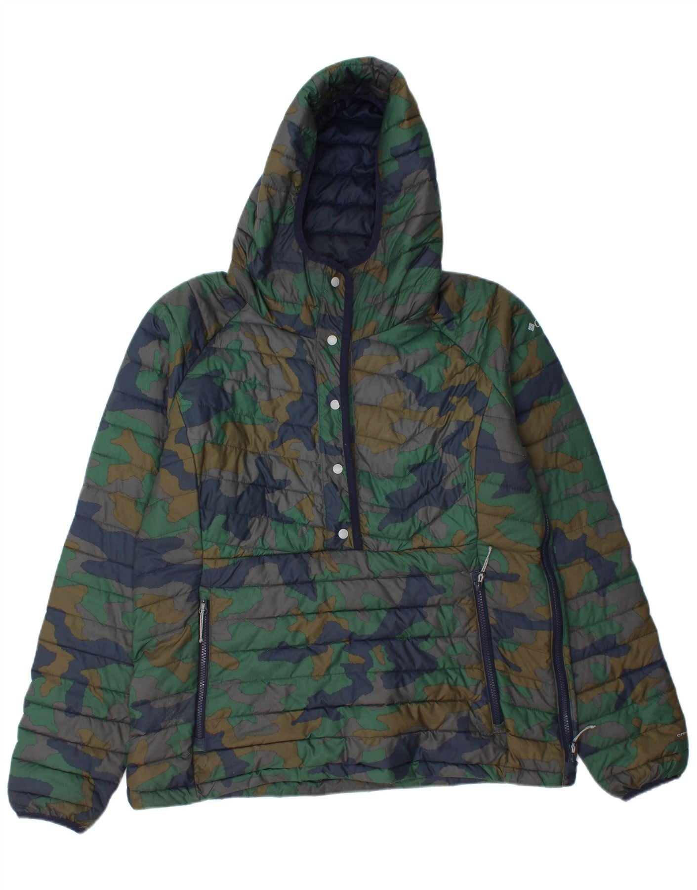 - AI Description: This Columbia men's anorak jacket is crafted from a durable woven fabric, offering a padded, thermal design. It features a distinctive multicoloured camouflage pattern, blending green, navy blue, and brown tones. The pullover style includes a high neck and a practical hood for added warmth. Long sleeves and a regular fit ensure comfortable wear. Functional zip accents and multiple pockets enhance its utility and army-inspired style.