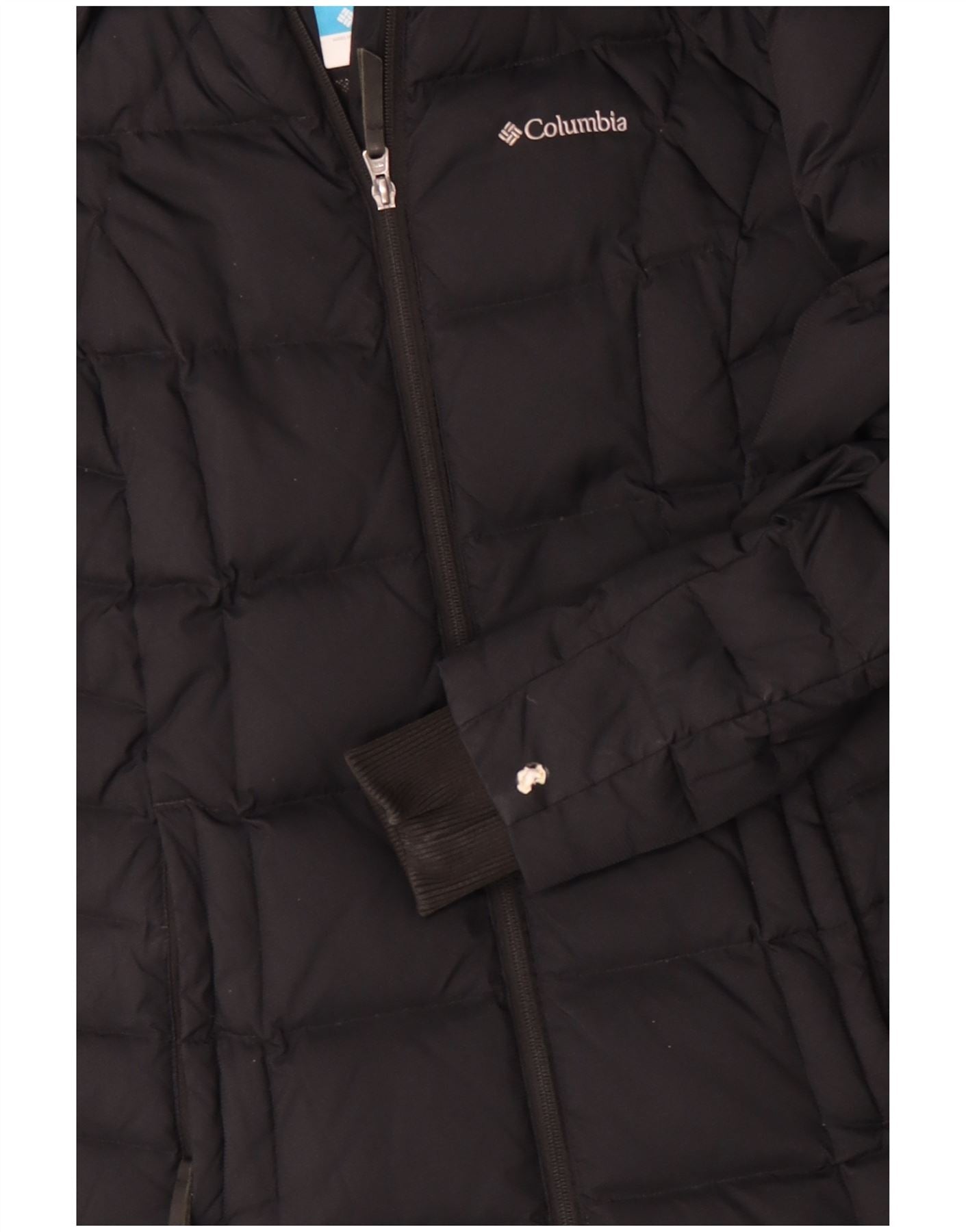 - Descrizione dell'IA: Questo cappotto imbottito da donna Columbia è realizzato in tessuto imbottito in piuma nera, che offre calore e una consistenza liscia e imbottita. Presenta uno scollo con colletto e una chiusura full zip. Le maniche lunghe con polsini a coste offrono un comfort extra. La vestibilità regolare garantisce facilità di movimento. Un pratico cappuccio aggiunge protezione, mentre le tasche con cerniera offrono spazio sicuro. Il logo Columbia fornisce un sottile accento del marchio.