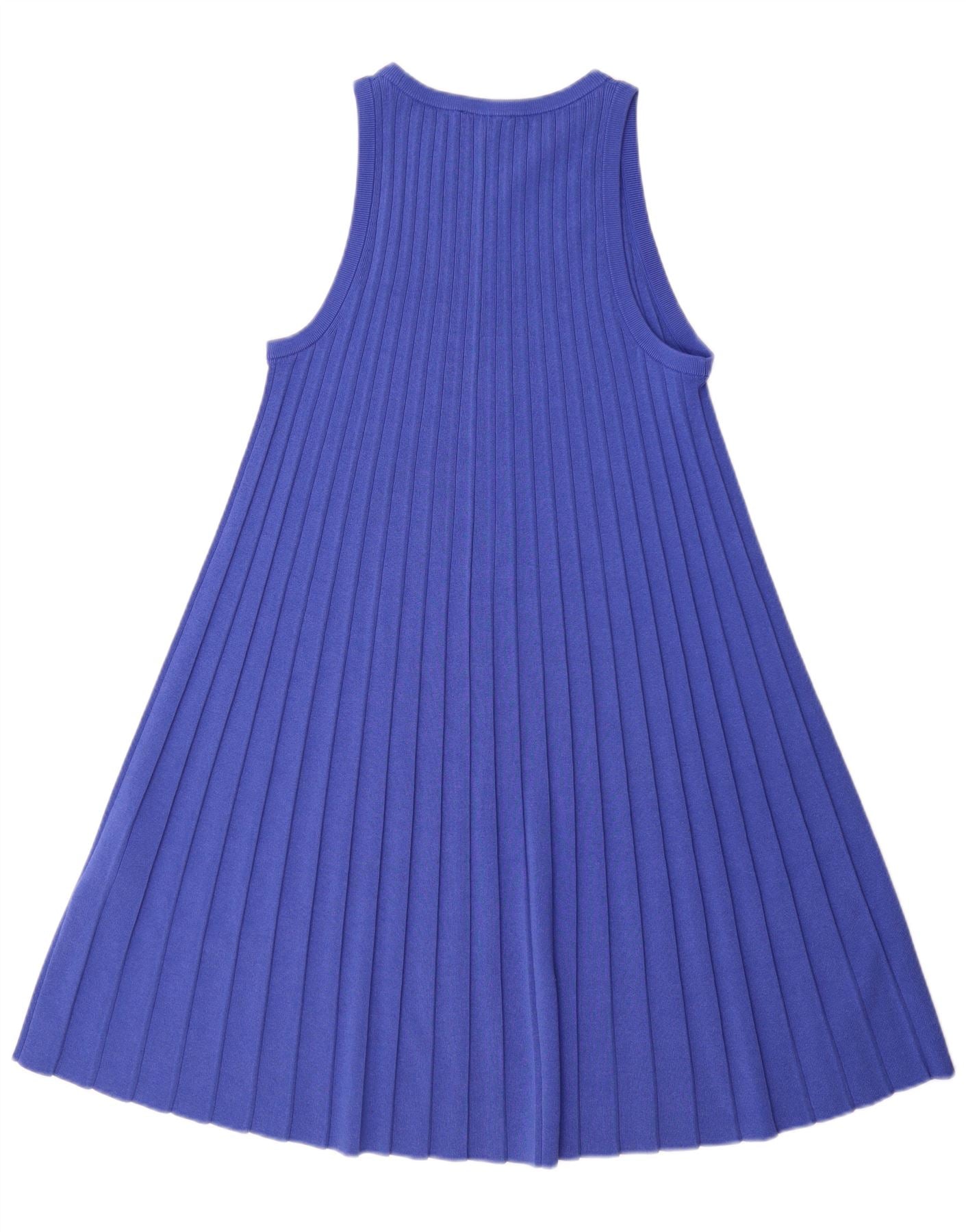 - Descrizione dell'IA: Questo abito a trapezio da donna Cos è realizzato in un vivace tessuto a maglia blu con una distinta trama a coste. Presenta un classico scollo rotondo e un design senza maniche. La vestibilità rilassata sfocia in un'elegante silhouette a trapezio. Le nervature verticali aggiungono interesse visivo e struttura al design moderno. È uno stile semplice da pullover, che offre un'eleganza senza sforzo.