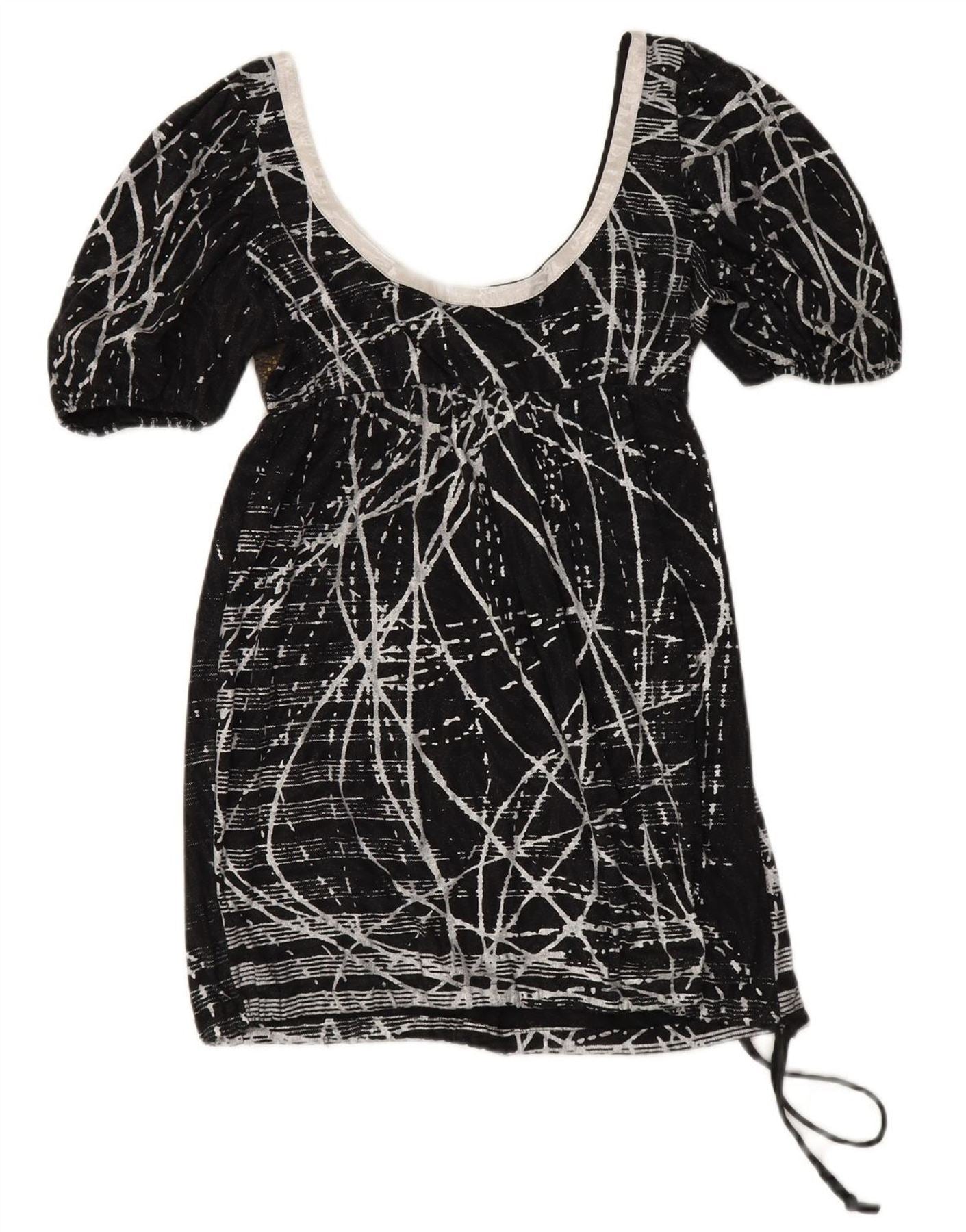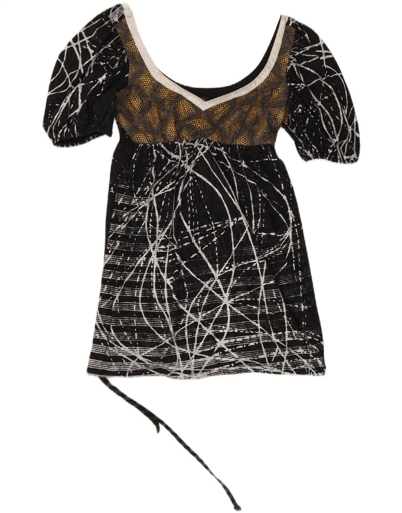 - AI Description: This Custo Barcelona women's Empire dress is crafted from a comfortable black knit fabric with stretch. It features an eye-catching geometric abstract pattern throughout. The round neckline and short sleeves offer a classic, relaxed look. Its empire waist creates a flattering silhouette, flowing into a regular fit skirt. The layered detailing adds unique visual depth to the design.