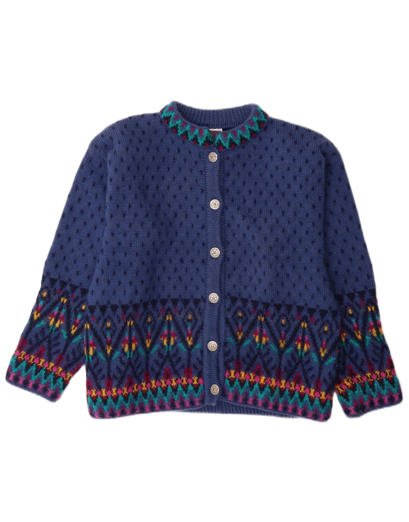 - AI Description: This Dale Of Norway womens cardigan sweater is crafted from pure new wool, offering a luxurious knit texture. It features a distinctive blue Fair Isle pattern, rich in traditional detail. The round neck includes a button closure, adding a classic touch. Long sleeves and a regular fit ensure comfort and timeless style. This piece combines heritage design with premium warmth, perfect for sophisticated layering.