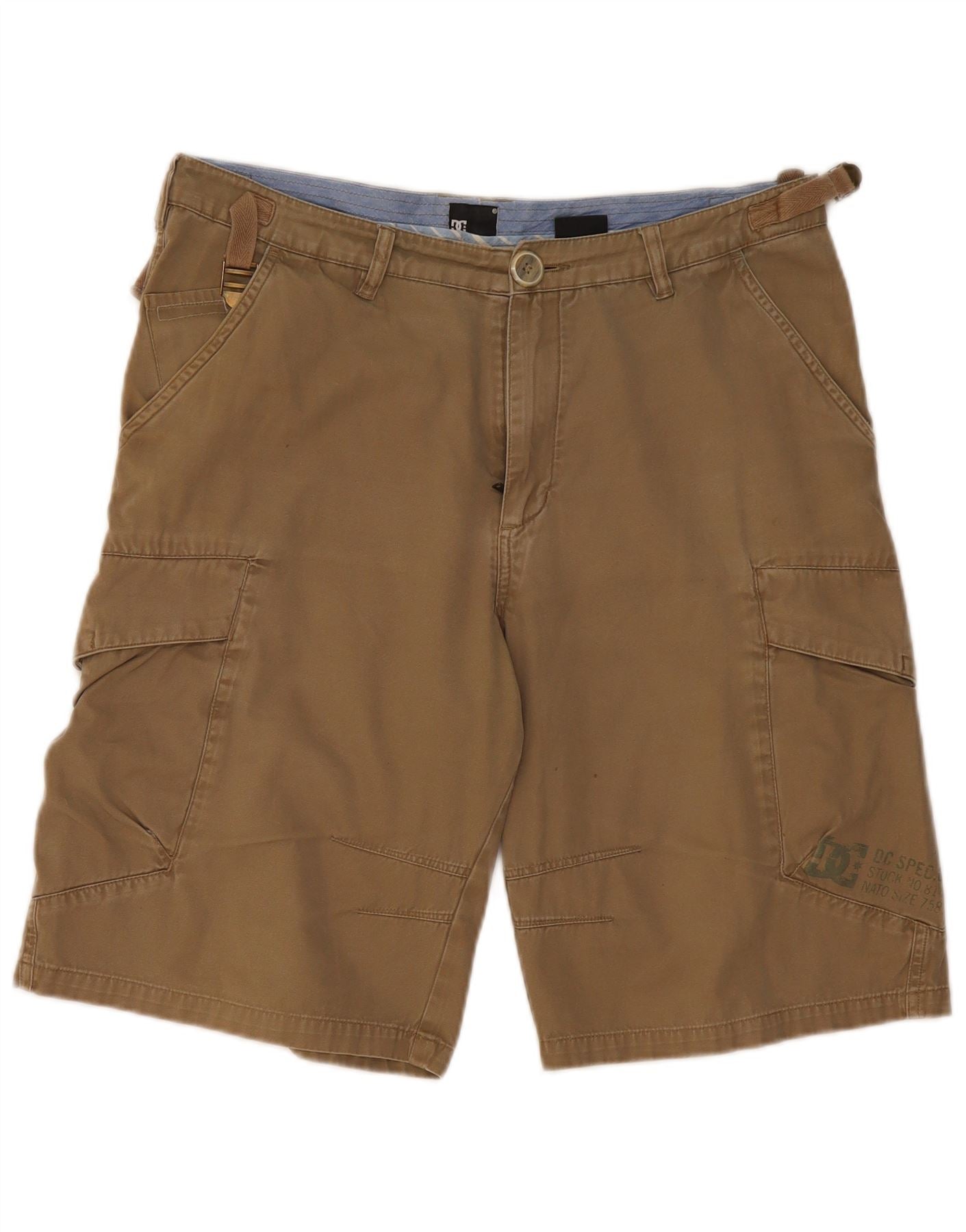- AI Description: This DC mens Cargo Shorts are crafted from durable khaki woven fabric. They offer a regular fit for comfortable wear. The button and zip closure provides a secure fastening. Practical utility pockets are integrated throughout. A subtle brand logo adds a modern finishing touch. These shorts are perfect for versatile casual styling.