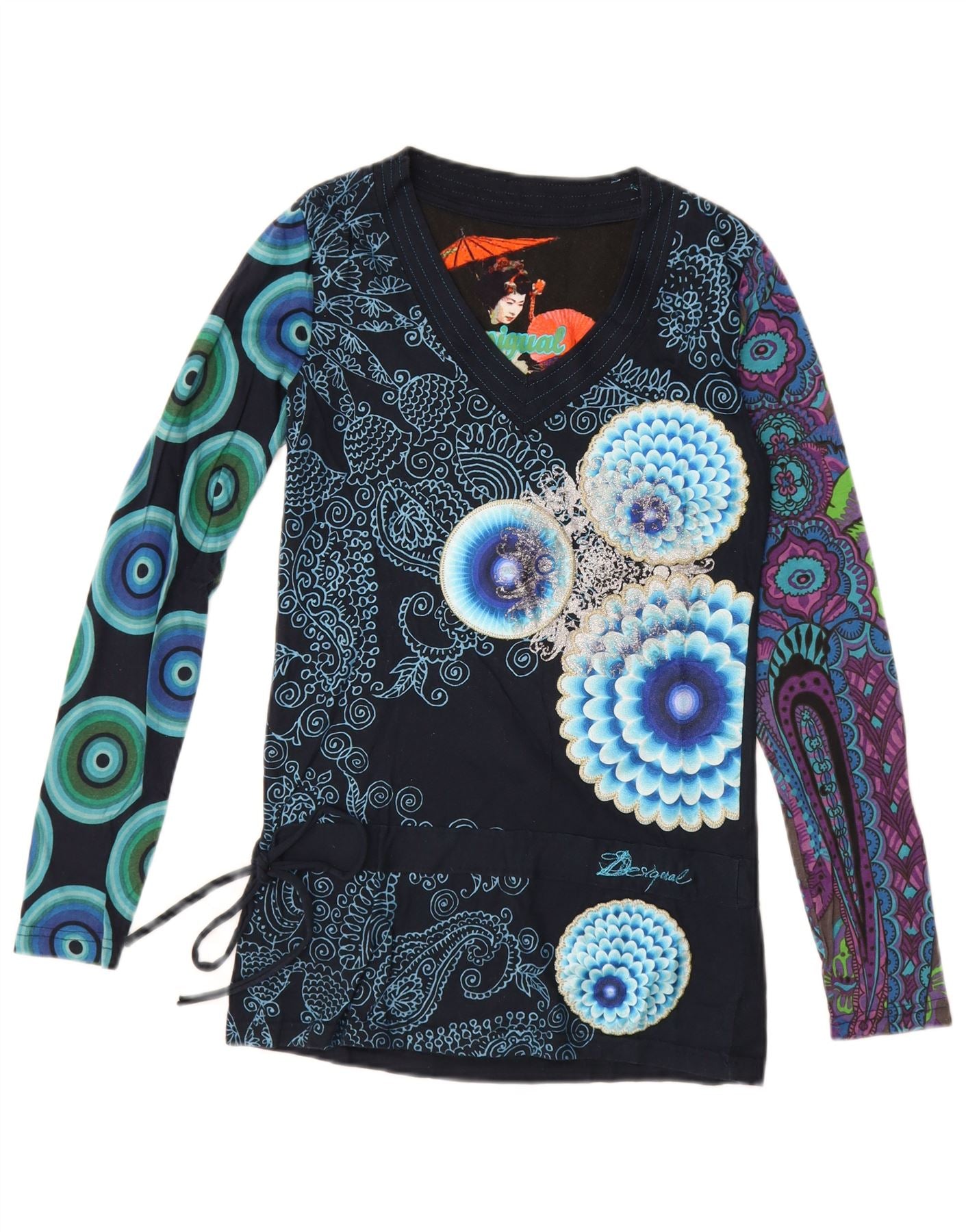 - Descrizione dell'IA: Questa maglietta grafica da donna Desigual è realizzata in morbido tessuto jersey nero. Presenta uno scollo a V e maniche lunghe. La vestibilità regolare offre una vestibilità comoda. Un vivace motivo patchwork adorna la parte anteriore e le maniche, mettendo in mostra intricati disegni floreali e geometrici. Il logo Desigual è sottilmente integrato. I lacci laterali regolabili aggiungono un tocco unico, esaltando lo stile bohémien. Questo maglione è perfetto per un look casual distintivo.