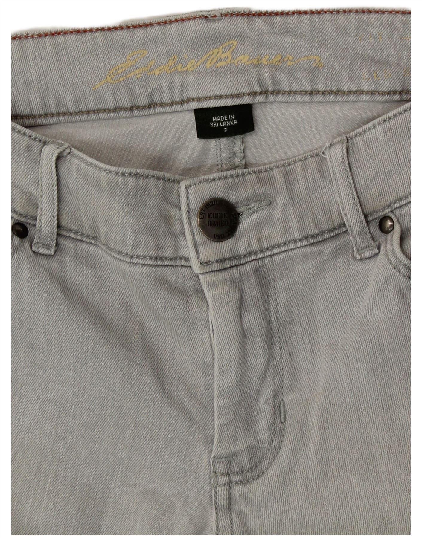 - Descrizione dell'IA: Questi jeans slim da donna Eddie Bauer sono realizzati in denim grigio con maggiore elasticità. Il classico stile cinque tasche presenta una chiusura con bottoni. La loro vestibilità slim offre una silhouette aerodinamica. Questi jeans offrono comfort e un'estetica senza tempo. Prodotto nello Sri Lanka.
