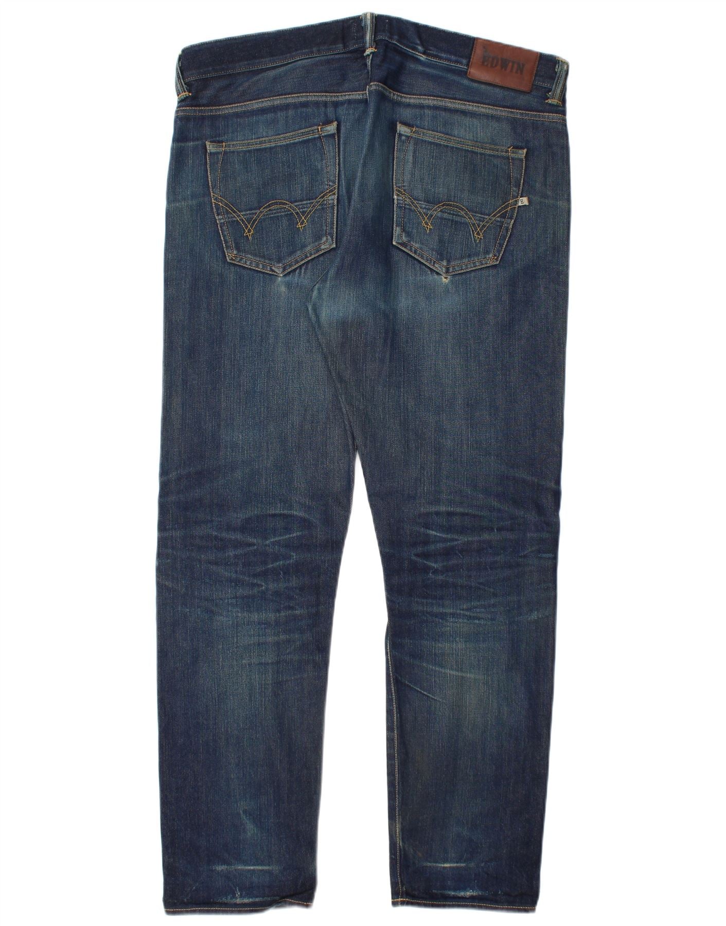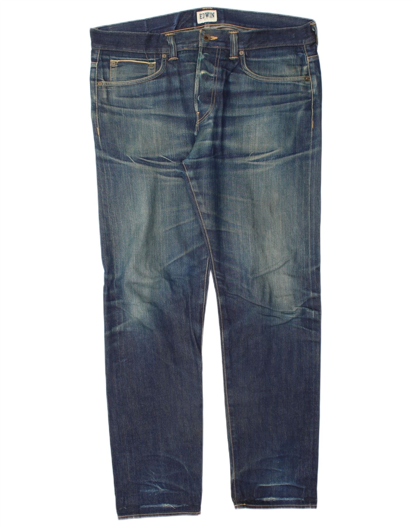 - AI Description: This Edwin mens slim jeans are crafted from blue denim, offering a subtly distressed texture. They feature a slim tapered fit, narrowing neatly towards the ankle. The classic button closure provides a secure fastening. Practical five-pocket styling is included. A discreet brand logo accents the design, ensuring a modern and versatile look.