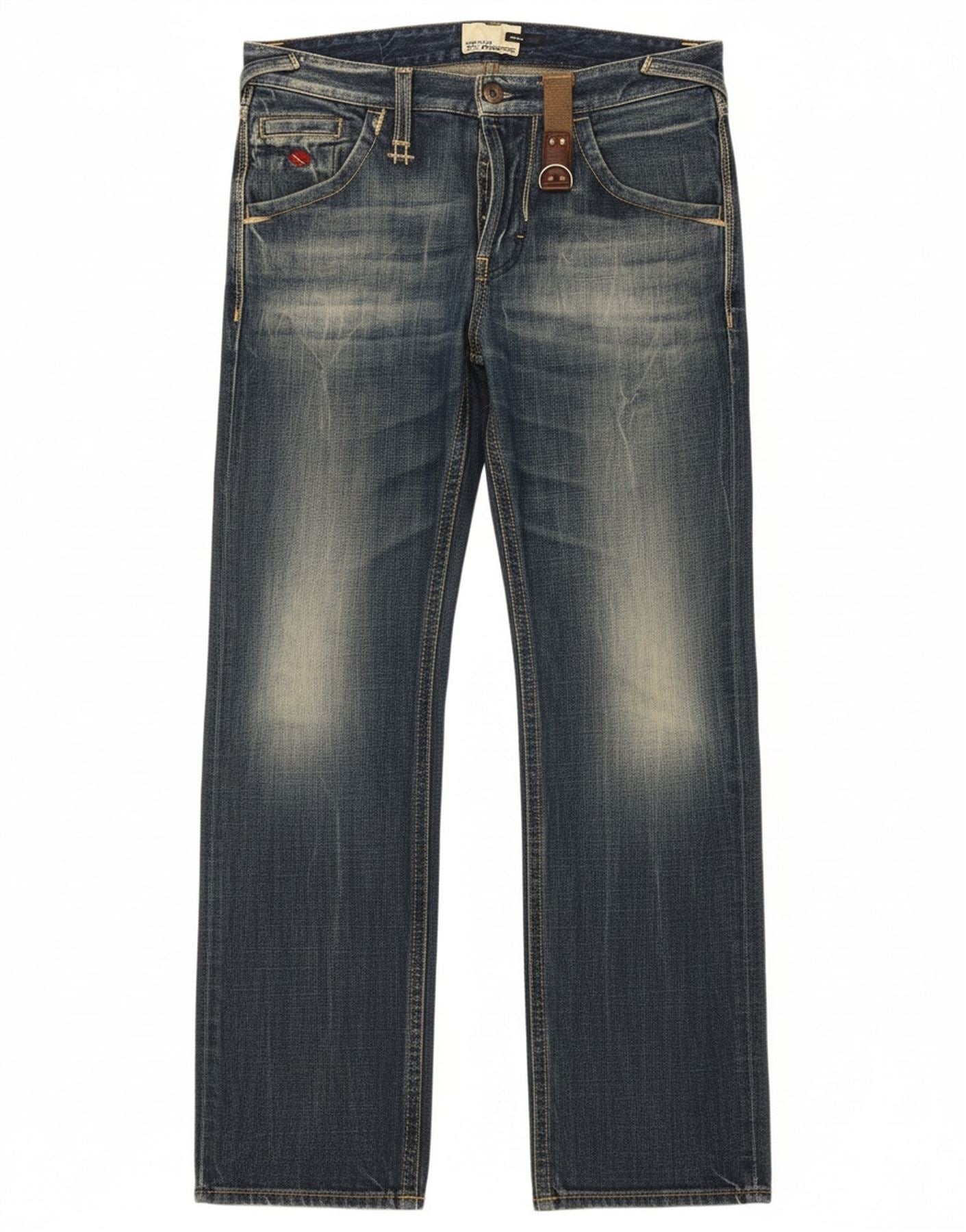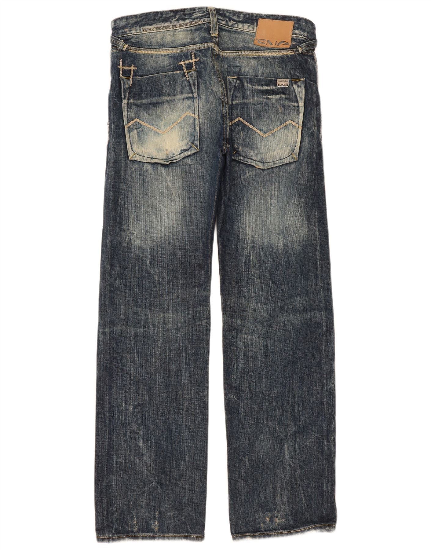 - AI Description: These Energie mens straight jeans are crafted from 100 percent cotton denim. The blue wash features a distressed finish for a worn-in look. They offer a regular fit with a classic straight leg. A button closure secures the waist, complemented by practical pockets. Subtle studded accents add a touch of detail. This Clash model embodies a timeless, classic style.