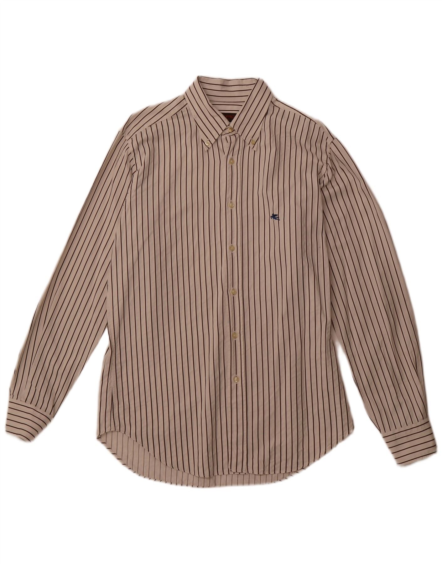- AI Description: This Etro mens shirt is crafted from a finely woven fabric in an off white hue. It features a subtle striped pattern, adding refined visual interest. The collared neckline and long sleeves offer a classic silhouette. A button-up front ensures a neat finish, complementing the classic fit. A discreet logo detail provides a signature touch, embodying timeless style.