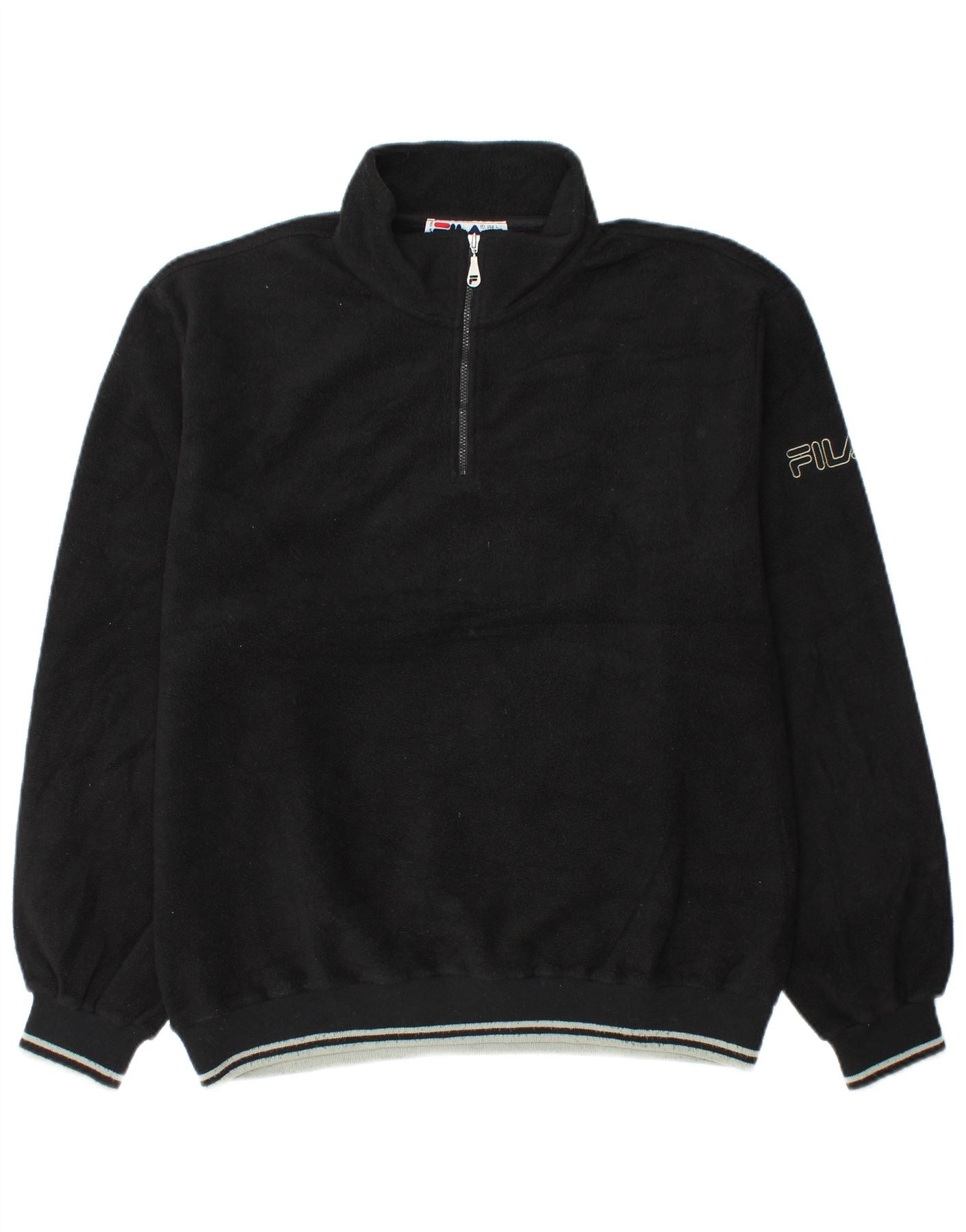 - Descrizione dell'IA: Questa felpa da uomo Fila è realizzata in morbido pile di poliestere nero, che offre comfort termico. Presenta il collo alto e la pratica chiusura con zip 1/4. Le maniche lunghe e la vestibilità regolare garantiscono facilità di movimento. Un sottile logo Fila accentua il petto. I polsini e l'orlo a coste includono un dettaglio a righe a contrasto, che aggiunge una finitura sportiva.