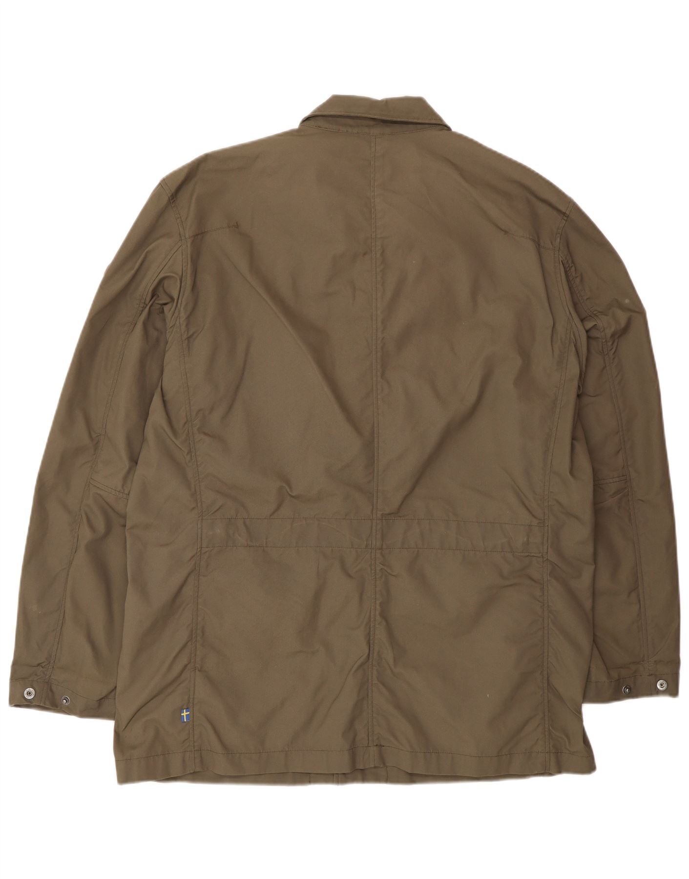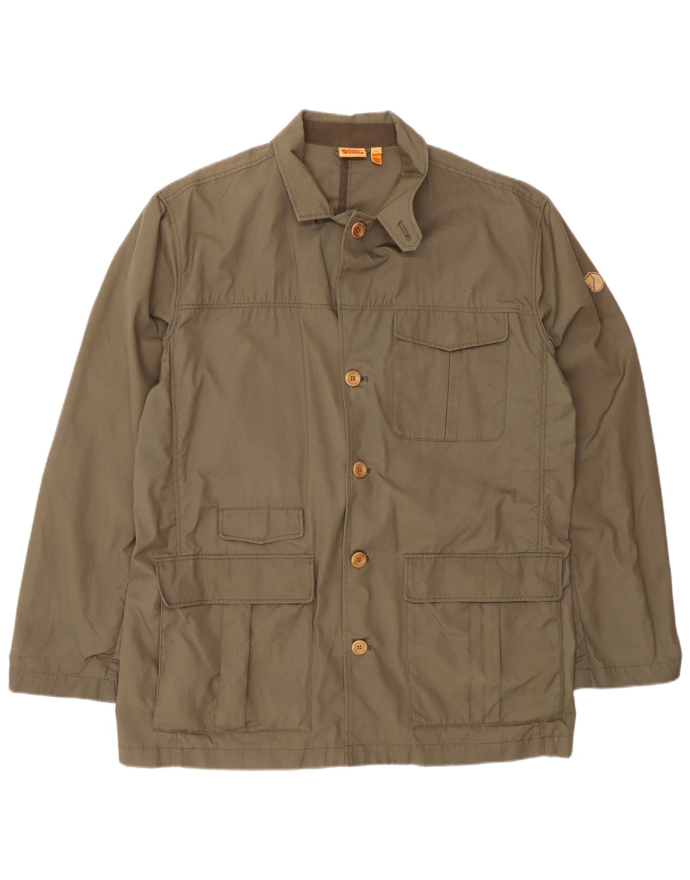 - AI Description: This Fjall Raven mens Utility Jacket is crafted from a durable khaki blended fabric. Its collared neckline and long sleeves offer classic structure. The button-up front and multiple pockets enhance its practical, military-inspired design. A regular fit ensures comfortable wear and ease of movement. This jacket is also water resistant and windproof, making it ideal for outdoor adventures.