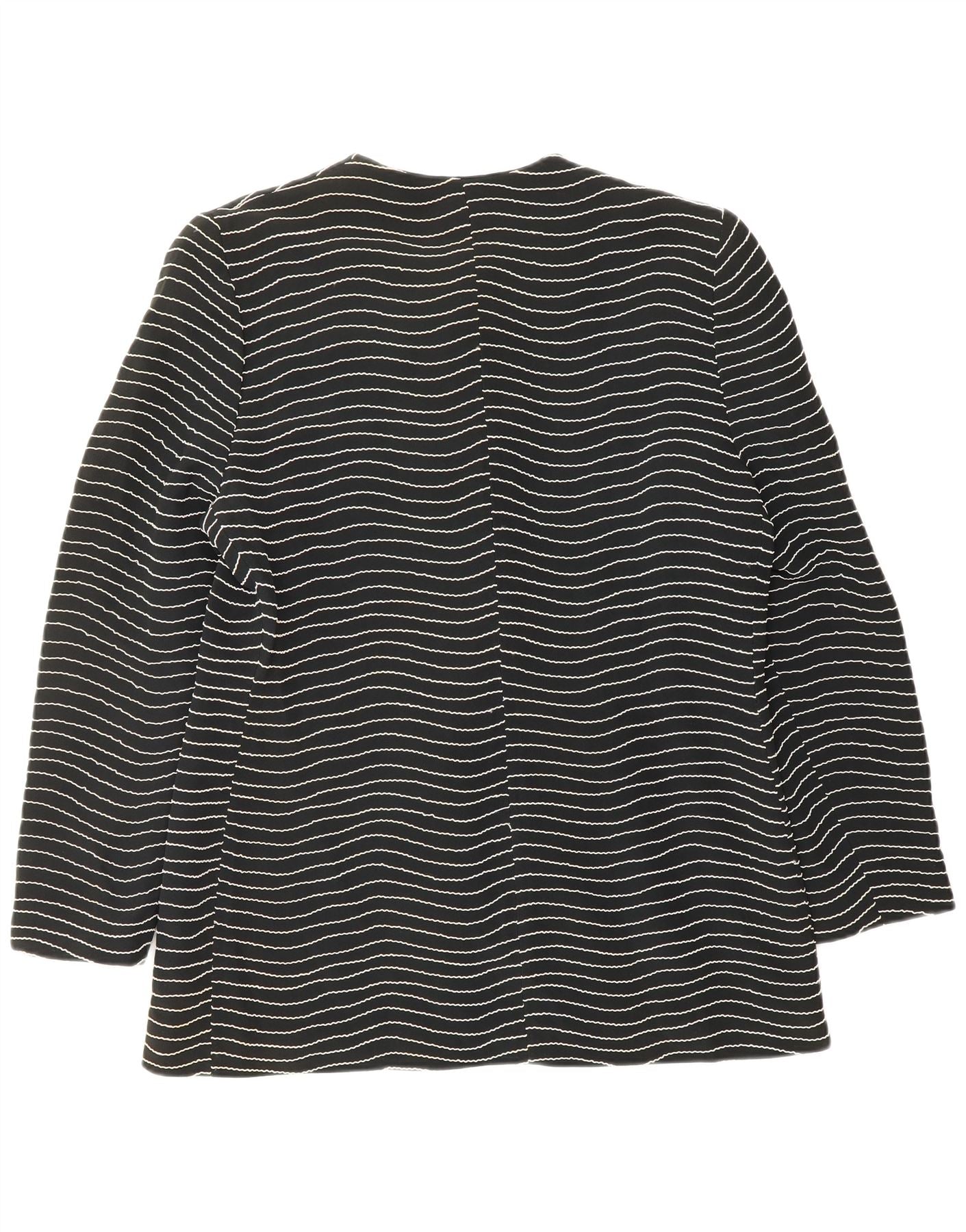 - Descrizione dell'IA: Questa giacca blazer da donna Gai Mattiolo è realizzata in tessuto nero. Presenta un caratteristico motivo geometrico di linee ondulate su tutto il corpo e maniche lunghe. Il classico design a girocollo offre una silhouette sofisticata. Sette bottoni decorati con perline forniscono una sorprendente chiusura frontale. Questa giacca dalla vestibilità regolare combina una sartorialità strutturata con dettagli visivi unici, perfetta per un completo elegante.