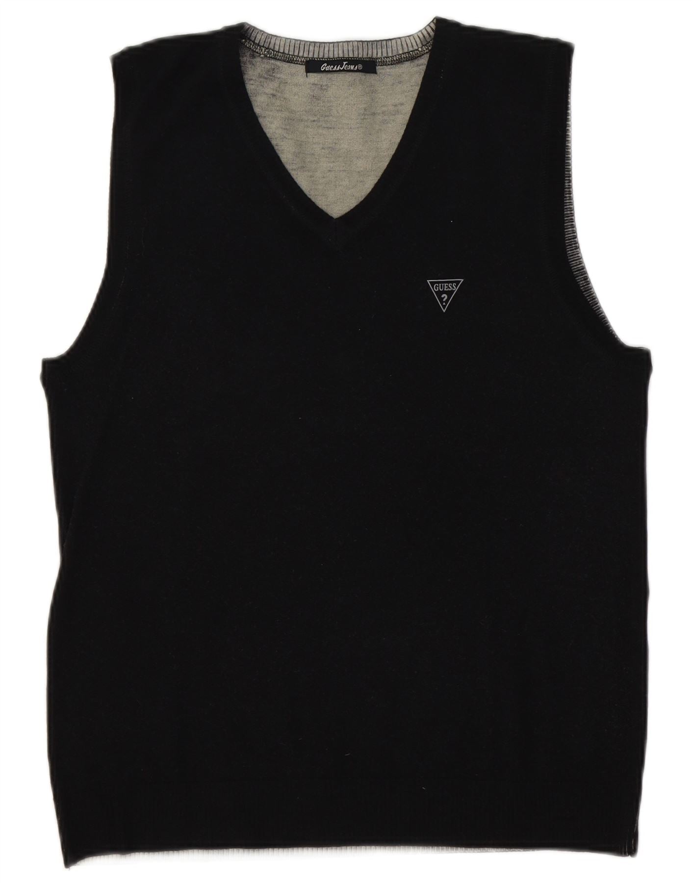 - AI Description: This Guess mens sleeveless V-neck jumper is crafted from a luxurious wool blend knit. It offers lightweight comfort and stretch for everyday wear. The classic V-neckline and regular fit create a refined silhouette. A subtle brand logo adds a signature touch to this versatile pullover style. Its black colour ensures timeless appeal.
