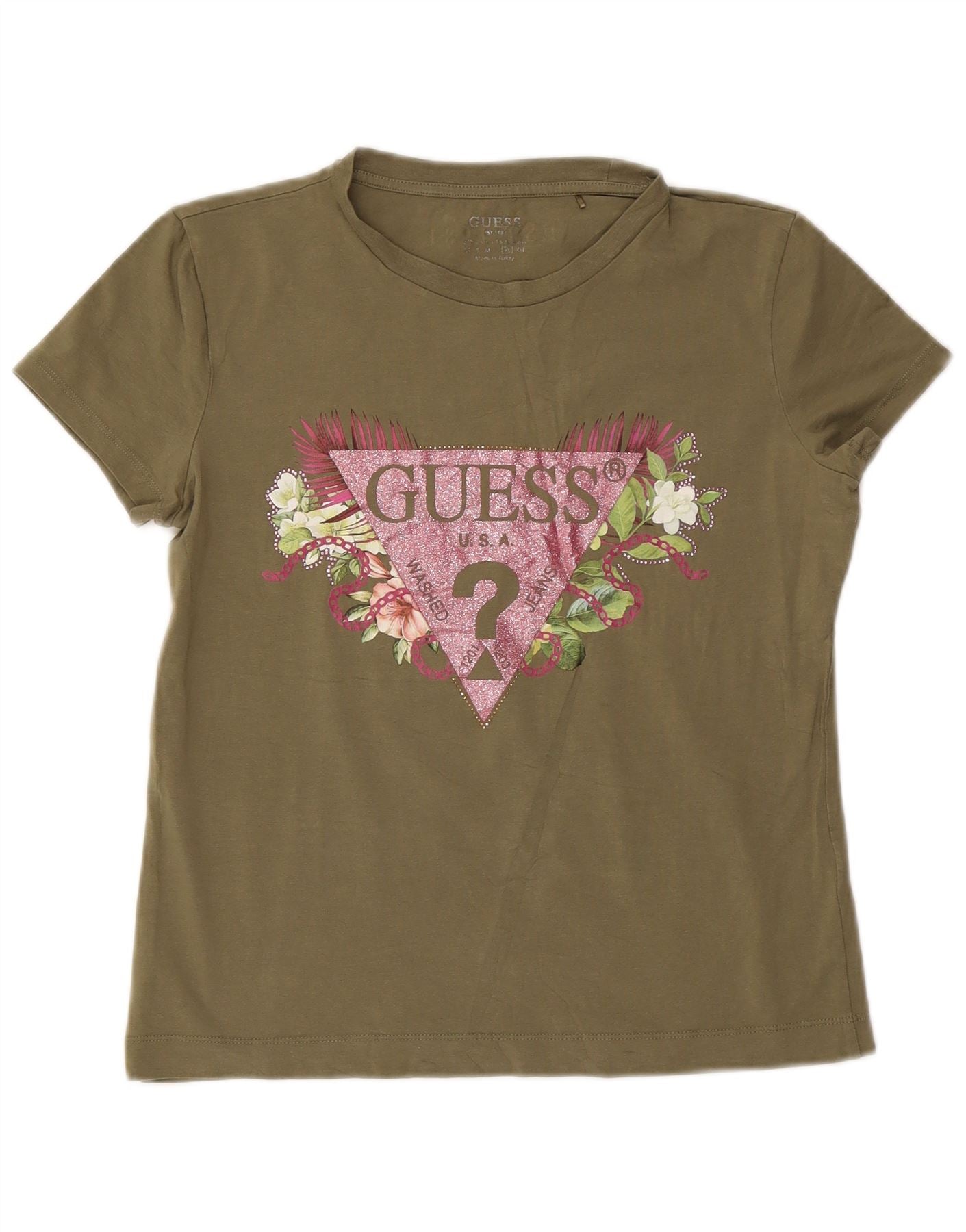 - Descrizione dell'IA: Questa maglietta grafica da donna di Guess è realizzata in morbido tessuto jersey color kaki, offrendo una sensazione leggera e confortevole. Presenta un classico girocollo e maniche corte. La vestibilità regolare garantisce una silhouette rilassata. La parte anteriore presenta un logo Guess prominente, finemente dettagliato con un vivace motivo floreale e sottili accenti glitterati. Questo modello di maglione combina uno stile casual con un fascino visivo distintivo.