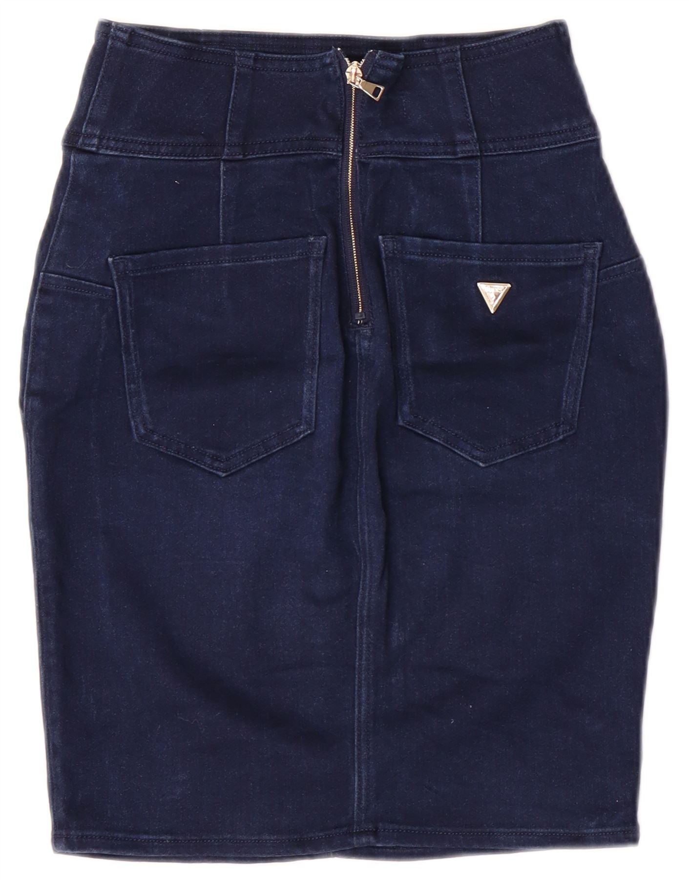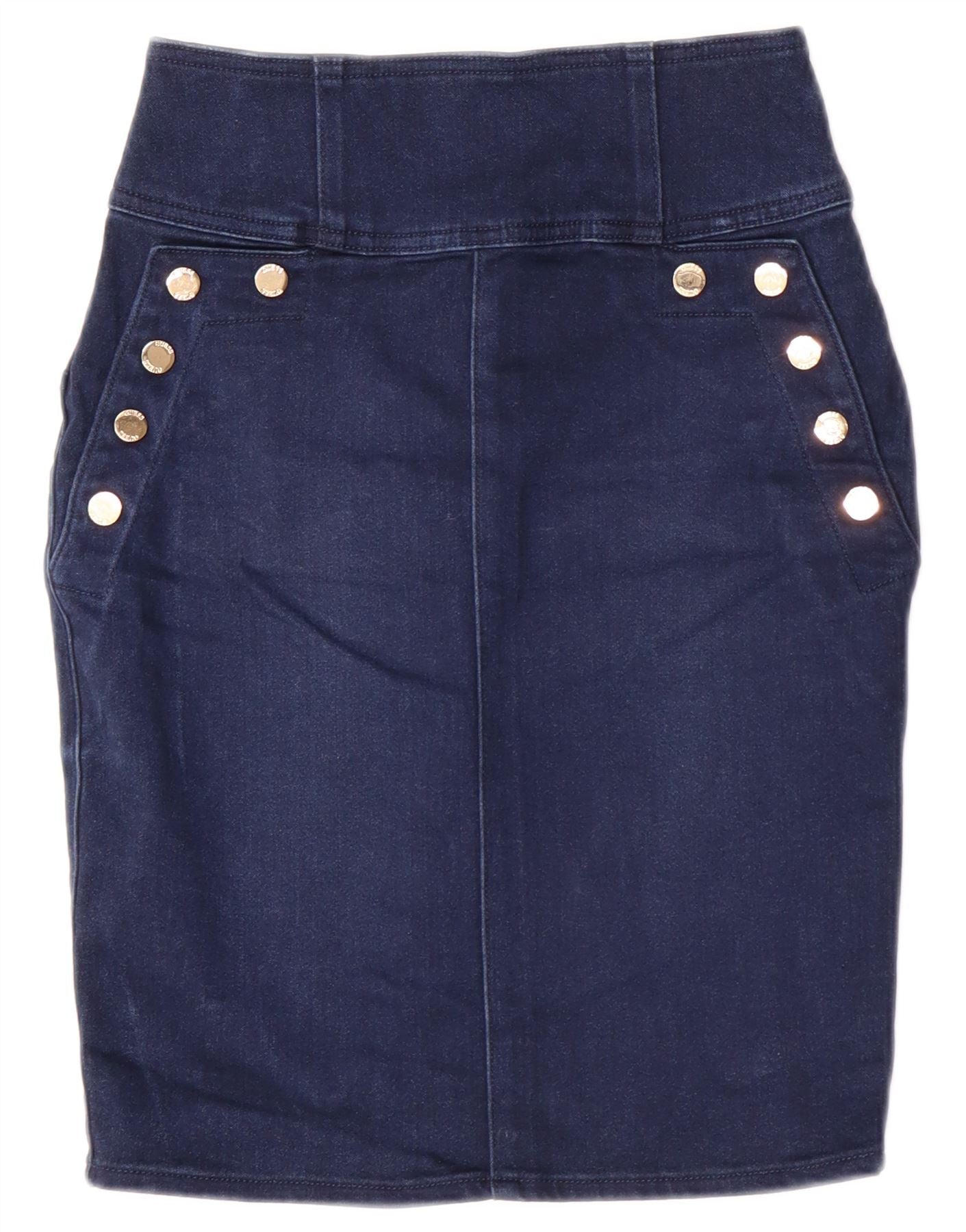 - Descrizione dell'IA: Questa gonna denim da donna di Guess è realizzata in misto cotone con finitura liscia. La vestibilità slim e il taglio classico creano una silhouette lusinghiera. Presenta una chiusura con zip e bottoni decorativi sulle tasche anteriori. Il denim blu scuro offre un look versatile e senza tempo. Le tasche posteriori e un sottile dettaglio del logo completano il design.