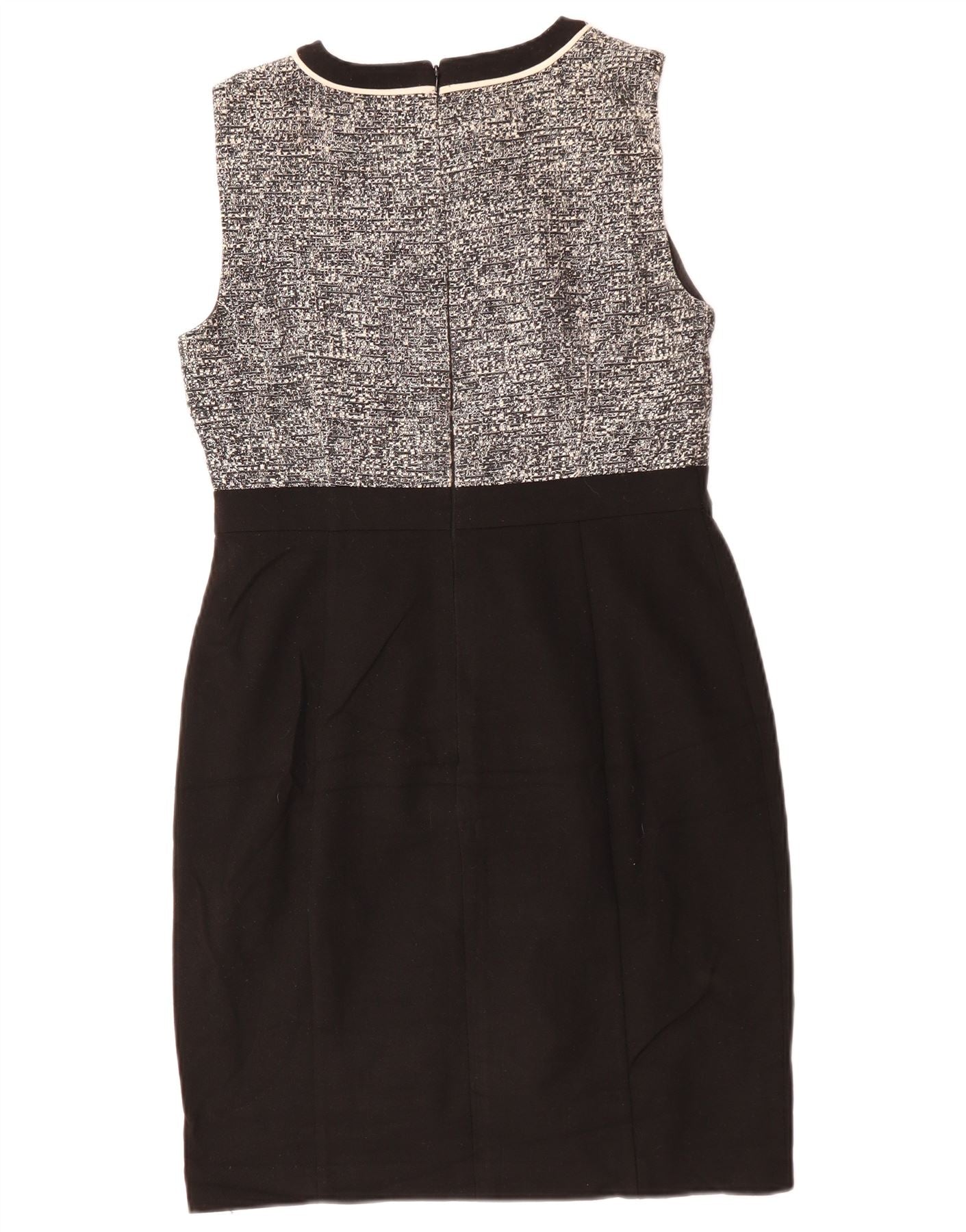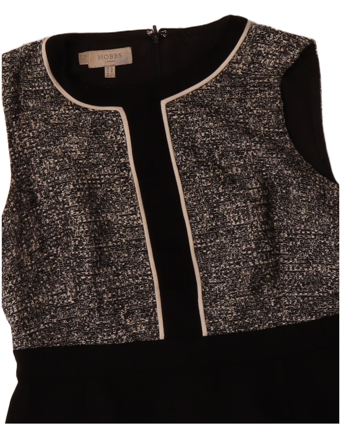 - Descrizione dell'IA: Questo tubino da donna Hobbs presenta un sofisticato corpetto in tweed screziato bianco e nero. La gonna inferiore è realizzata in tessuto nero liscio. Ha uno scollo rotondo classico e un taglio senza maniche. Un bordo a contrasto delinea lo scollo e il pannello centrale. La vestibilità regolare offre una silhouette lusinghiera. Il motivo screziato sul corpetto aggiunge interesse strutturale. Una chiusura con zip posteriore garantisce una finitura ordinata.